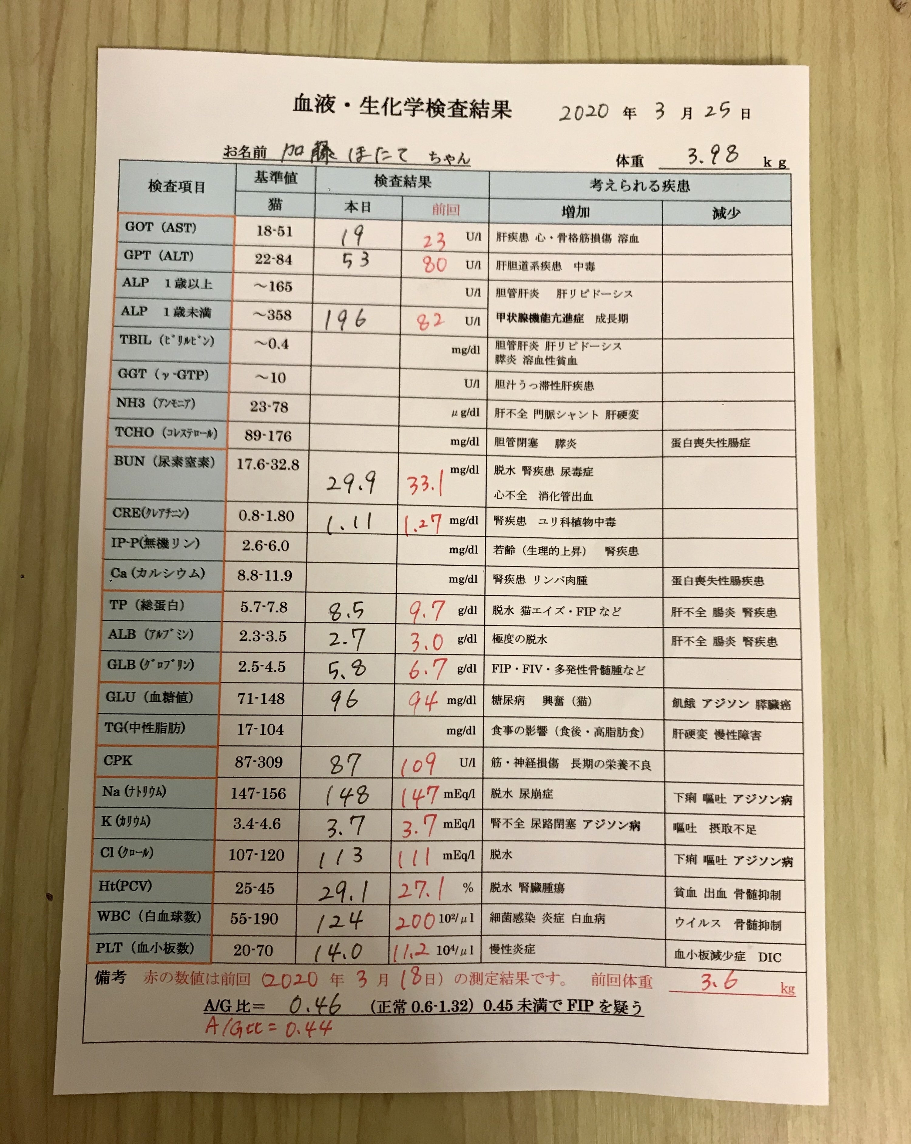 3/25(水)3ndオピニオン先の病院へ先週の血液検査の結果を受取りと経過観察の報告をしに行きました。検査結果はグロブリン・総蛋白の数値がやや高いのとナトリウムの数値が若干高いくらいでした!お薬の効果は手に取るように見えてます!とはいえ油断は禁物ですと言う先生のお言葉も頂きました。充分ほたての様子に注意していきます。また、体重の増加に伴いMUTIANの量が600㎎に増えました…。また近々買い足さないとなりません。今回も血液を採取され外部の検査機関で検査をしますしかし、通院の頻度は月1で良くなりました、次回は4月下旬ごろ通院予定です。本日の診療費 3ndオピニオン先 血液検査等 13700円