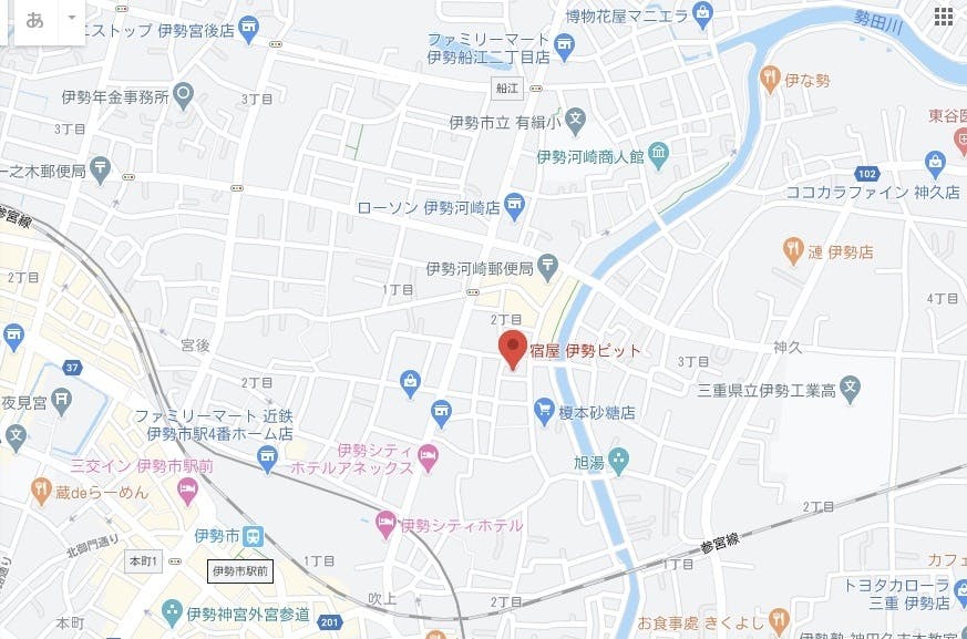 宿屋伊勢ピットがあるのは、伊勢市駅から徒歩で7.8分。