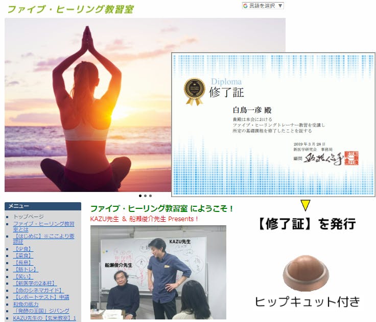 2014年、医療・環境ジャーナリスト船瀬俊介氏と共同で、e-ラーニング『ファイブ・ヒーリング教習室』を立ち上げ、 “5つのセルフ・ヒーリング” をウェブ上で広げています。