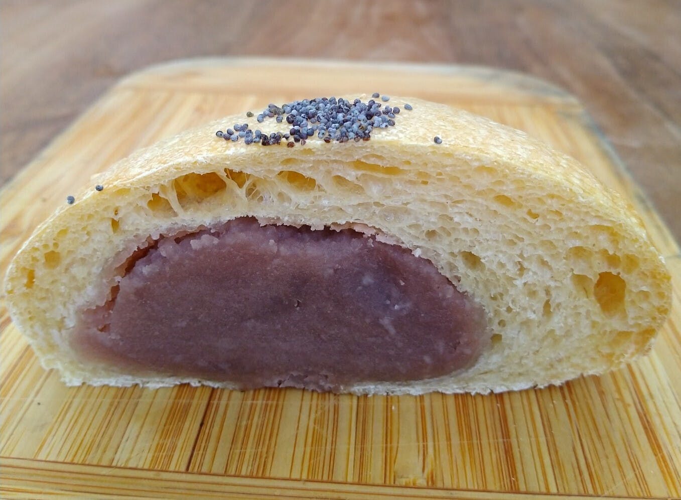 (人気の味噌餡クリームパン(上)と甘酒アンパンの断面(下))