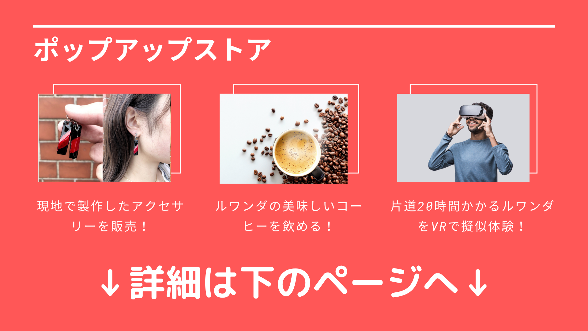 「ルワンダに行ってみたいけど、なかなか遠くて行けない。。。」といった声を多くいただいたので、VRでルワンダを擬似体験できるスペースを併設します。ルワンダの街に没入する体験を提供いたします!