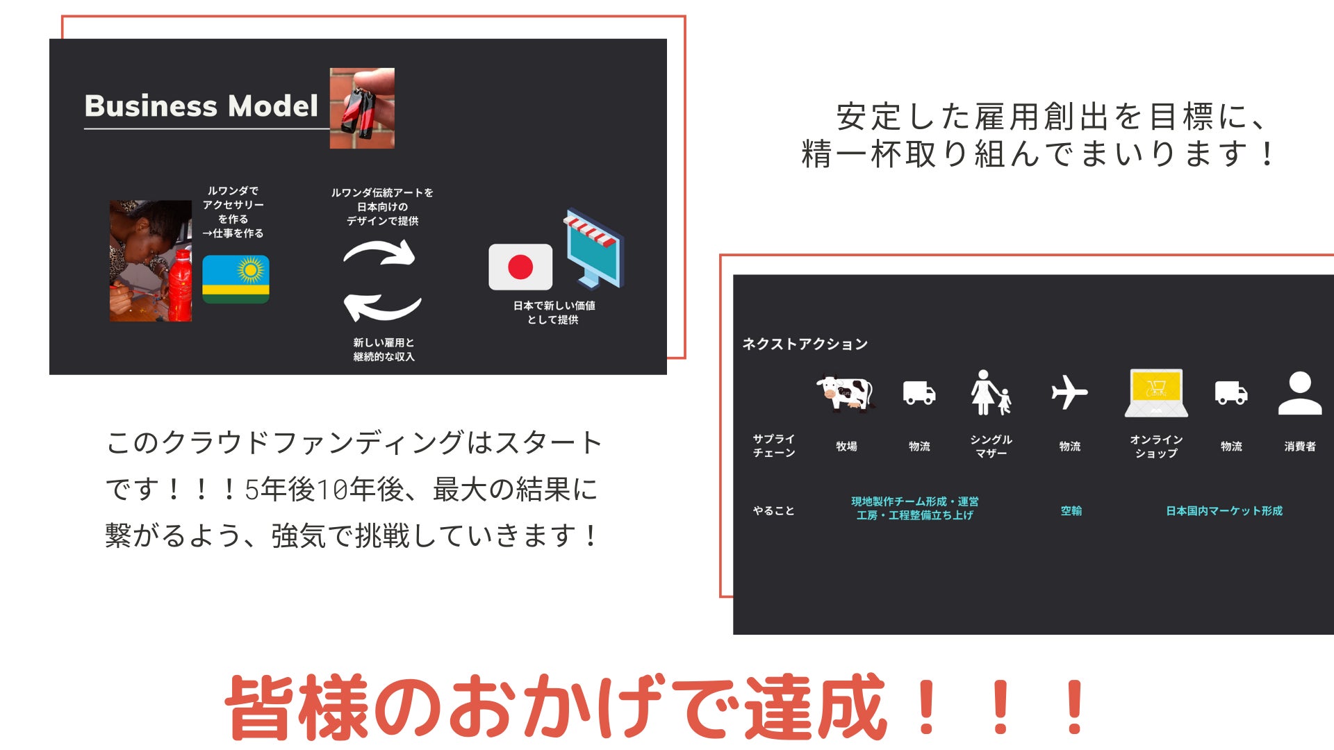 クラウドファンディングを通して先行販売する目的として、どういったものに需要があるのか調べるという意味も込めています。支援者の皆様からの意見をいただき、皆様とともによりルワンダの貧困層の方々に恩恵をもたらすことができるプロダクトを見つけていきたいと考えております。