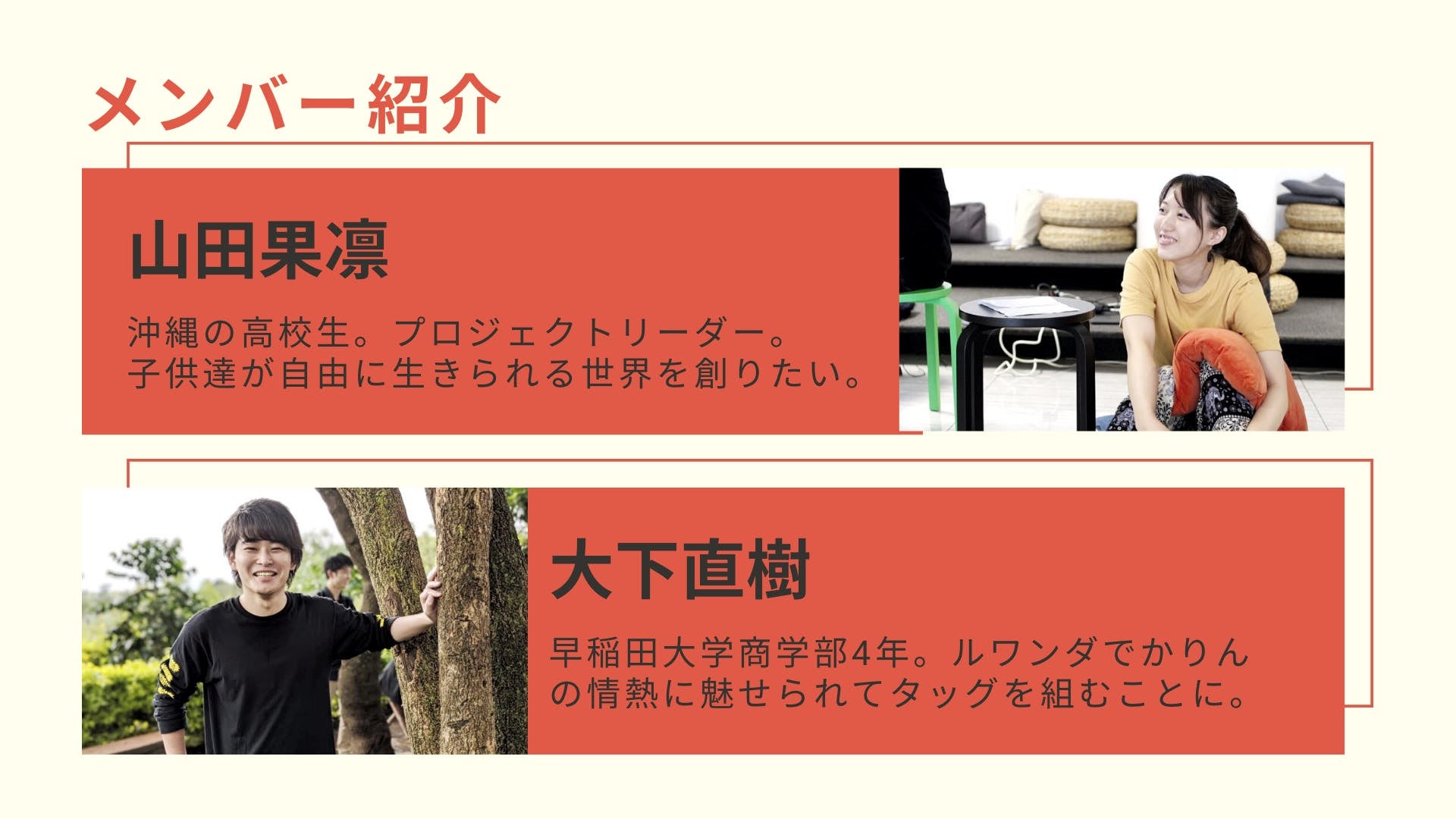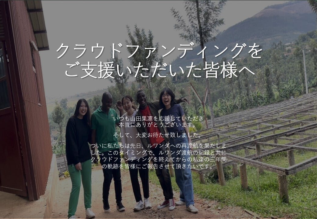 2022/07/07 07:35いつも応援してくださる皆様へお世話になっております、プロジェクトオーナーのかりんです!ご支援いただいている皆様にご報告が遅れていること、大変申し訳ございません。------------------------------------------------「高校生がアフリカ貧困層の子供を救う!伝統工芸をRe:Designして新たな価値へ」<現状報告>新型コロナウイルスの世界的流行のため、当初予定していた2020年8月の渡航を2023年3月(予定)に延期する判断を致しました。この活動を少しでも早くスタートさせ、現地のシングルマザーの皆様、その子供たちに還元したいという想い、この活動を応援していただいていた皆様にいち早くリターンをお届けしたい想いがあったため、苦渋の決断ですが、今回の判断をしました。また、ネクストゴールに指定させていただいたポップアップストアのオープンの日時も、ルワンダ渡航後である2023年4月以降に変更させていただきます。渡航日変更に伴い、リターンのお届け時期を以下のように変更させていただきます。・イミゴンゴ手作りアクセサリー(卸売販売プランを含む): 2020年9月(当初) → 2023年4月(変更後)ピアスは現地に工房を作り、現地の方々が製作しているということが重要だと考えているので、2023年の渡航時に工房を作り、そこで完成したものをお届けします。・アンテナショップコーヒー1杯引換券: 2020年9月(当初) → 2023年4月(変更後)渡航延期に伴い、ポップアップストアオープンの日時を2023年4月以降に変更させていただくため、こちらの納期とさせていただきます。・現地の子供からの感謝のポストカード: 2020年9月(当初) → 2023年4月(変更後)2023年に渡航した際に現地で子供の写真を撮影し、ポストカードを作成するため、こちらの納期とさせていただきます。・イミゴンゴ写真集: 2020年9月(当初) → 2023年4月(変更後)2023年に渡航した際に現地で製作者の想いをお伺いし、それを写真集に落とし込みたいと考えているため、こちらの納期とさせていただきます。・オリジナルデザインイミゴンゴ: 2020年9月(当初) → 2023年4月(変更後)現地にて購入者様からご依頼いただいたデザインで製作したいと考えているため、こちらの納期とさせていただきます。・キテンゲハンカチセット: 2020年9月(当初) → 2022年10月(変更後)現地と連絡を取り、輸入が可能であることを確認いたしましたので、ルワンダから輸入し皆様にお届けいたします。新型コロナウイルスで物流に支障が出る可能性もあるので余裕を持った納期とさせていただきます。・バナナペーパーを利用したサンクスレター: 2020年9月(当初) → 2022年10月(変更後)現地と連絡を取り、輸入が可能であることを確認いたしましたので、ルワンダから輸入し皆様にお届けいたします。新型コロナウイルスで物流に支障が出る可能性もあるので余裕を持った納期とさせていただきます。・イミゴンゴ Small & Large: 2020年9月(当初) → 2020年10月(発送済)現地と連絡を取り、ルワンダから輸入し皆様にお届けさせていただきました。お待たせしてしまって申し訳ございませんでした。・ルワンダコーヒー 300g: 2020年9月(当初) → 2020年10月(発送済)現地と連絡を取り、輸入が可能であることを確認いたしましたので、ルワンダから輸入し皆様にお届けいたします。新型コロナウイルスで物流に支障が出る可能性もあるので余裕を持った納期とさせていただきます。ご迷惑をおかけいたしますが、ご理解の程よろしくお願いいたします。また不明点につきましては、本文最後にあるメールアドレスまでご連絡をお願いいたします。渡航日は変更になってしまいましたが、その分、ピアスの商品企画、マーケティング企画に時間を使い、より良いプロダクトを支援者の皆様、ひいては日本の皆様にお届けするための準備期間と捉えています。こちらもこのCAMPFIREの活動報告機能を使い、ご報告させていただきますので、ぜひ楽しみにしていてください!----------------------------<現在取り組んでいるプロジェクトについて>渡航日の延期に伴い、今回のクラウドファンディングの目玉であったピアスの製作が延期になってしまいました。しかし、そんな状況の中でも、「ルワンダに還元できるプロジェクトを行うことができないか?」と考え、現在はルワンダ産のコーヒーを日本に輸入・販売し、その収益の一部をルワンダに寄付することでルワンダの子供達に還元する企画を進めております。内閣府の世論調査によると、日本人の約63%の方が、社会貢献活動に賛成だけど、時間・機会・関心がなく参画できていない状況にあります。ボランティア活動を通して「私も貧困がない世界を、山田さんと同じ夢を持っている。」と何度も心強いお言葉をいただきました。ですがその次に続く言葉が「でもどうしたらいいのかわからない。」「学業/仕事があるから山田さんのように海外に行けない。」とお聞きしました。ボランティア活動の中で出会った、もう3日も何も食べていないと言う小さな女の子の食費はたった