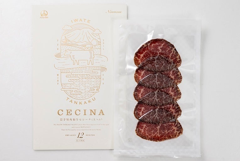 「ジャパン・セシーナ」は、和牛で唯一「旬」がある牛肉「岩手短角和牛」を使って作った熟成生ハムです。 和牛の中で1%未満しかいない日本固有の希少種で、自然放牧で育てるため脂肪が少なくアミノ酸が豊富な旨みが特徴です。