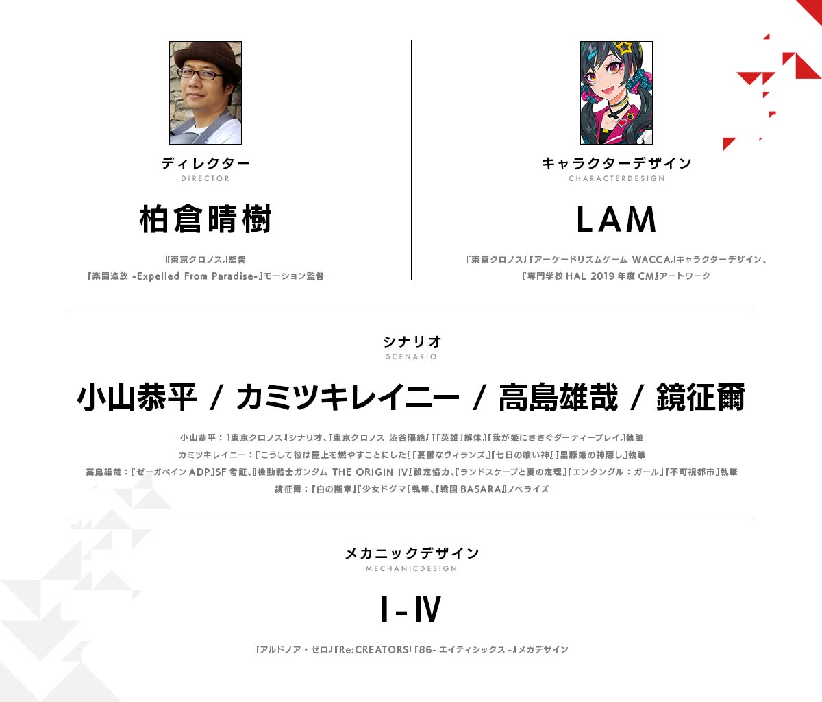 「東京クロノス」から続き、監督は柏倉晴樹、キャラクターデザインはLAMさん。そして以下のような豪華メインスタッフ。
