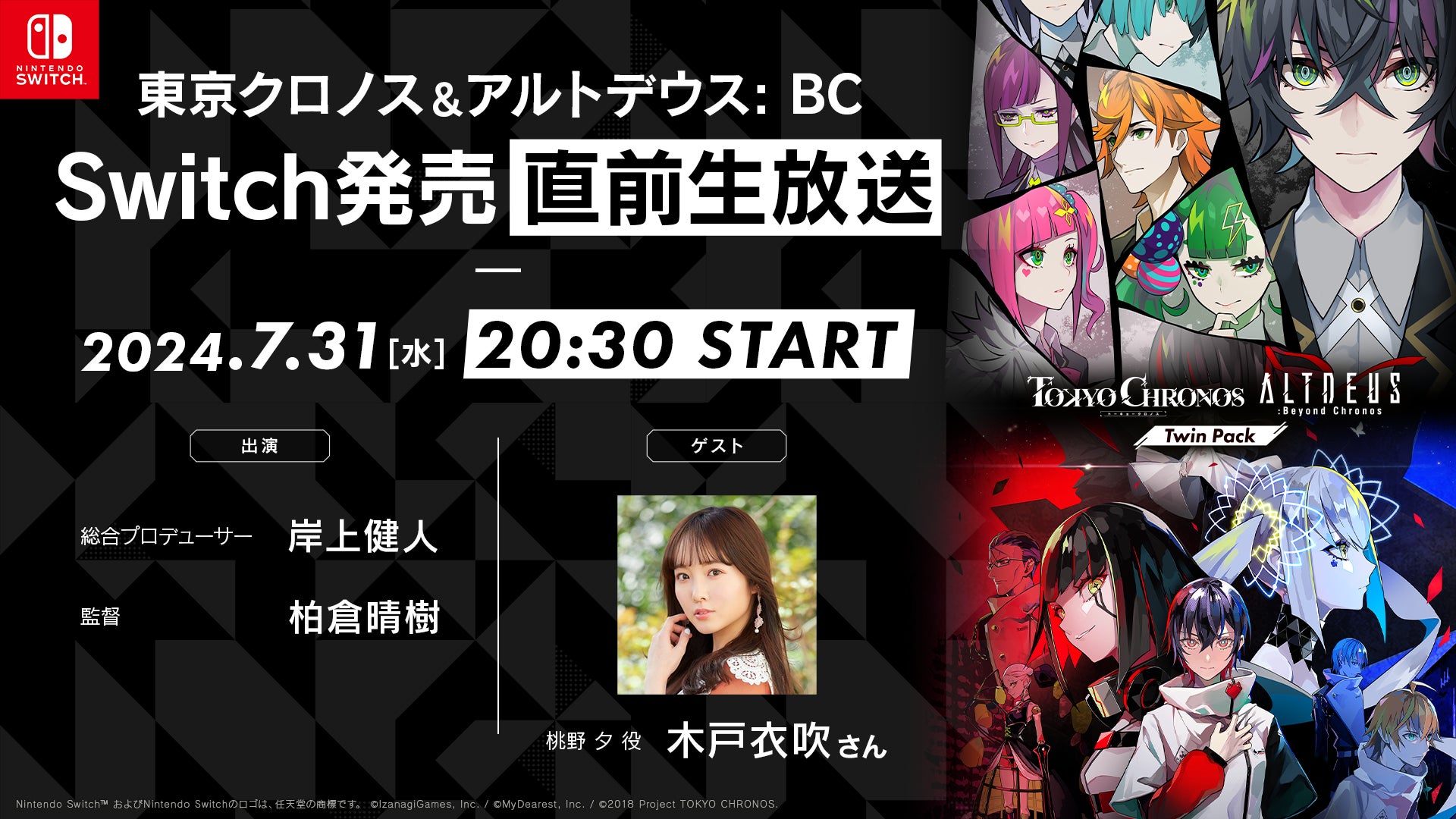 2024/07/31 15:56いつも「アルトデウス: BC」並びにクロノスユニバースを応援いただき誠にありがとうございます!制作スタッフの大野です。遂に明日【8月1日】に、Nintendo Switch「東京クロノス&アルトデウス: BC ツインパック」が全世界に向けて配信開始となります!それに先駆けて、本日【7月31日 20:30~】発売記念前日生放送を、「東京クロノス」桃野夕役 木戸衣吹さんをゲストに迎え、YouTubeLiveにて放送いたします!!MyDearestの物語は、クラウドファンディングを通じて”制作共犯者”の皆さまと共につくり上げた「アルトデウス: BC」の前作「東京クロノス」から始まりました。VRから端を発し、更に新たな形となって世界に羽ばたく本Nintendo Switch版の門出を、ずっと応援していただきました制作共犯者の皆さまに見届けていただけましたら幸いです。==========【7月31日 20:30~】『東京クロノス&アルトデウス: BC ツインパック』発売直前生放送!https://www.youtube.com/watch?v=pG34d5Slz_k出演者:岸上健人(「東京クロノス」「アルトデウス: BC」総合プロデューサー)柏倉晴樹(「東京クロノス」「アルトデウス: BC」監督)木戸衣吹(「東京クロノス」桃野 夕役)==========作品の紹介やNintendo Switchでの実際のプレイをお見せしつつ、最新情報もお届けできればと思います!ぜひ本日は放送をご覧いただけましたら幸いです。どうぞよろしくお願いいたします。制作スタッフ大野 もっと見る