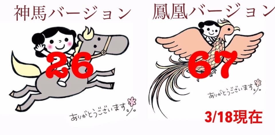 ご支援いただき、ありがとうございます!皆さまからの温かいコメントにとても嬉しく、励みになります。今回のステッカーイラスト、ここのところ、描いては消して、を繰り返していたのですが、その中で「鳳凰バージョン」かなぁ、と思っていたのですが、「神馬バージョン」もいいなぁ、と迷い出してしまいました。そこで、今回は皆様のご意見を募ろうと思いました。完全なる多数決で決めようと思います。Facebook,Instagram,Twitterにも投稿しております。それぞれにコメントいただいてもいいですし、こちらに「神馬」か「鳳凰」かだけコメントいただいても大丈夫です。ご協力くださいますよう、よろしくお願いいたします。神馬バージョン鳳凰バージョンどうぞよろしくお願い致します。