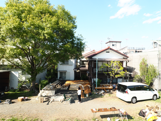 週末を利用して川田旅館のDIYリノベーションが順調に進んでいます。メインデッキとテラスデッキは非常に雰囲気のよい仕上がりになりつつあります! 木材には防腐剤とニス塗り。メインデッキからの多摩川河川敷を眺めるとシンボルツリーと空がとても良い感じで見えます。 川田旅館の柿の木は残しながらウッドデッキを建てつけ中。 お客様をお迎えするベンチを製作中 組みあがったデッキでさっそくコマカラメンバーが寛ぎました。皆さんにも早くこの雰囲気を体感してもらいたいです。 SOTO KAWADAの土手を上がると、TAMARIBAを開催した大きなヤナギの木と多摩川が一望できます!