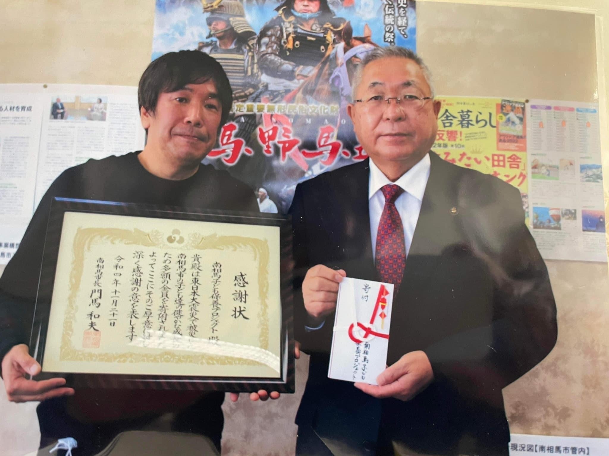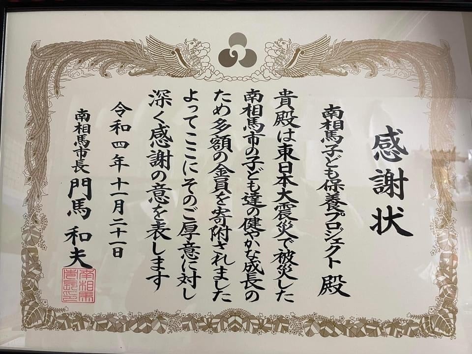 借りて寄付を南相馬市へさせていただいておりますが写真のような感謝状を頂いたのも