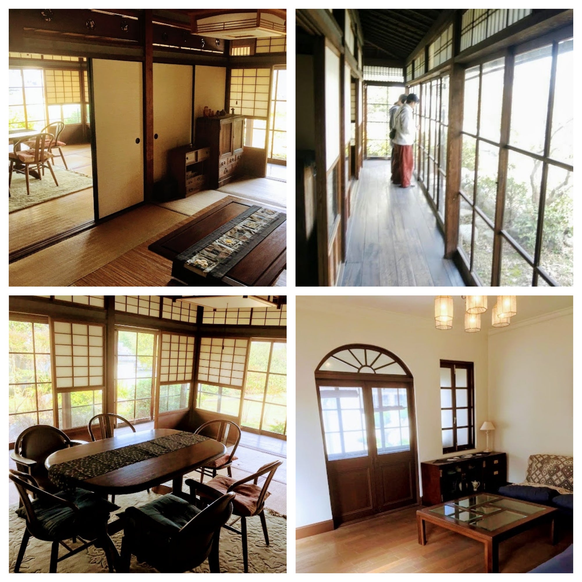 網代天井の本格的な和室、大正ロマンを感じる洋間、柔らかに光を通すアンティークガラス。