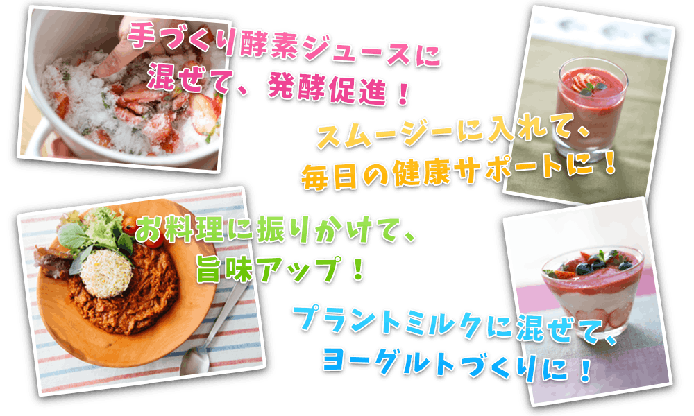 ・ナッツチーズ、豆乳ヨーグルト、ココナッツヨーグルト、漬物など様々な発酵食品を作る際に発酵助成剤としても使用頂けます。