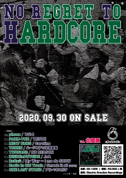 2020.09.30 IN STORES「No Regret To Hardcore」01.1214 / phone02.TRUTH / PAKU-TOH03.Caroline / MEAT BUNS04.ハードコアの初期衝動 / THORN05.NO REASON / TWOFACE06.JxA / INSiDExOUTSiDE07.My Way 〜 I ma de SHOW / BxCxG08.Smash it all(2020) / Radio In Old Trash09.アルベキスガタ / ONE LAST STAND品番 : EE-1006価格 : ¥2.000 + 税【特設サイト】https://elerecord.wixsite.com/noregret