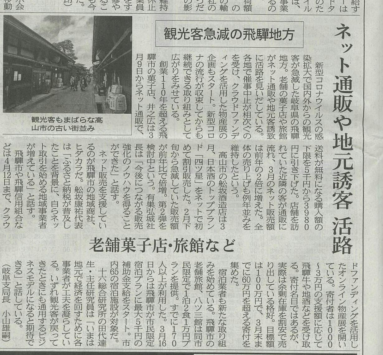 新型コロナの影響で日に日に厳しくなってくる状況ですが、そんな中でこのクラウドファンディングの取り組みを含めた飛騨の活動を、日経新聞さんの電子版、紙面両方にご掲載頂きました。