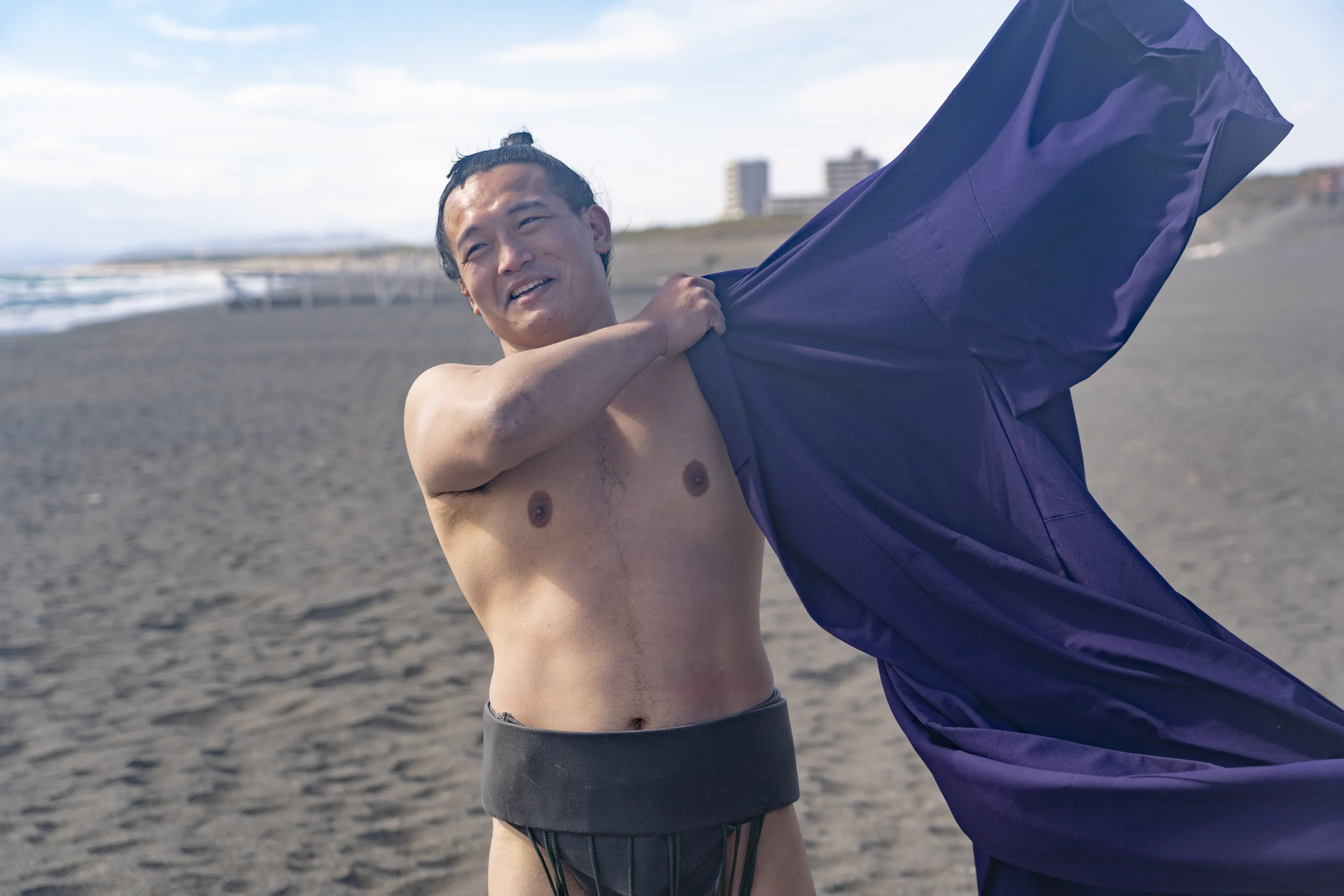 僕は6歳の時に相撲を習い始めて相撲で大学まで進学し、卒業後に大相撲へ入門、3年後に引退しました。競技として続けるには気持ちと身体の両方が限界で早くに引退したものの、僕は相変わらず相撲が大好きです。引退後の人生に悩んでいた僕ですが、みんなにもっと相撲を知って欲しくて、まわし一丁で路上ライブをすることしました。楽器は自分自身の巻いているまわし。これを叩いてまわしパーカッションに。初めは自作の歌やラップを披露してましたが、次第に道ゆく人と相撲を取るようになりました。
