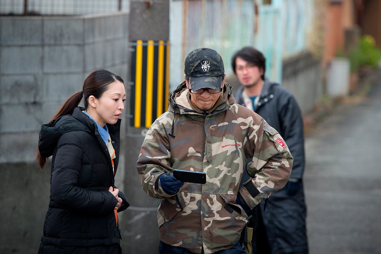 画像は撮影も後半戦に突入したあたり。昼間のロケ、道路上にてカメラアングルを確認しているところです。最近は便利なもので、カメラの映像をWiFiで飛ばしてスマホで見ることができるのです!今回は撮影部がいろんな便利グッズを導入して小人数の体制でも効率よく進行できる工夫をしてくれました。この辺はまたおいおい紹介していこうかとも思っております。
