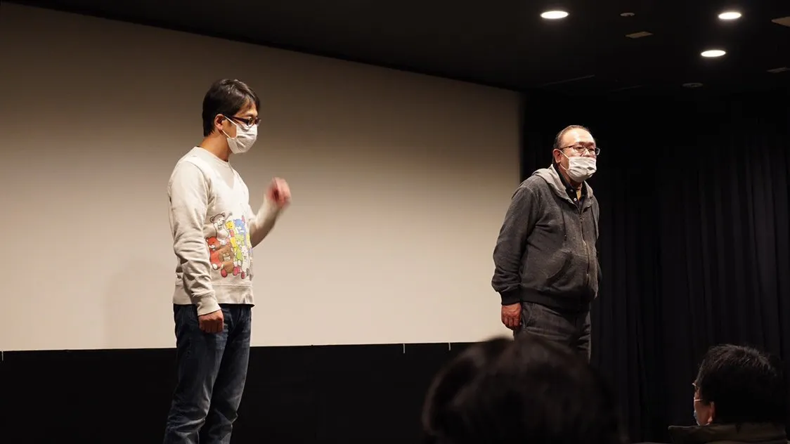 画像はプロデューサー前田氏と監督が挨拶を行っているところです。コロナ禍も寒くなるにつれ、また感染が広がりそうな懸念もあり、検温・消毒・マスクで対策しての上映となりました。