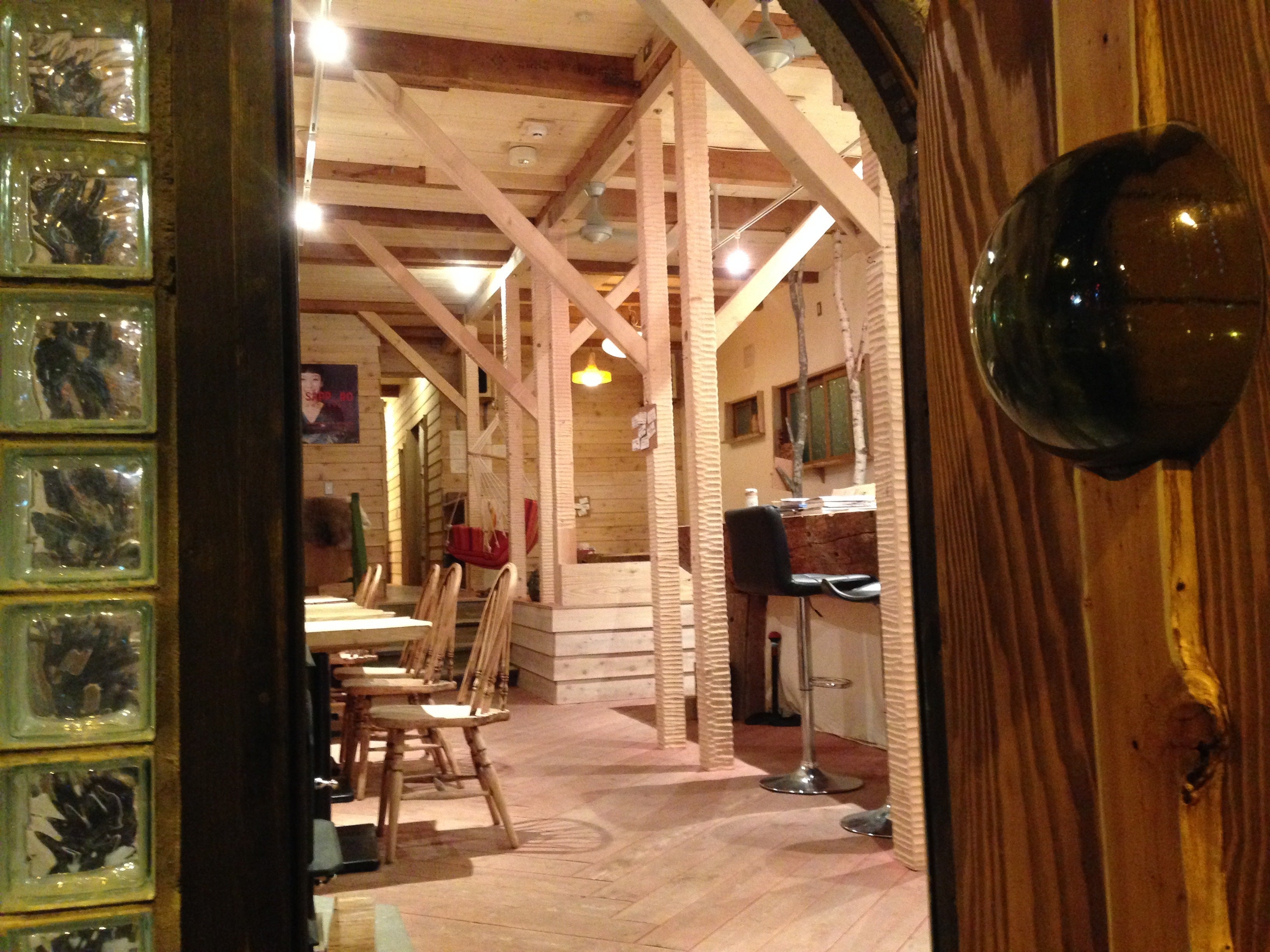 併設のバーレストランでは、樹齢360年の赤エゾ松の巨大カウンターが目を引きます。年輪数えました。専属シェフを抱え、北海道産の海鮮・刺身・燻製・野菜の料理を楽しめます。