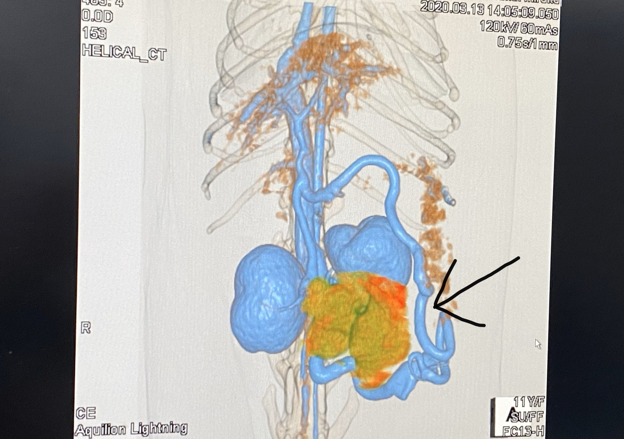 緑色の部分がリンパ腫、黒い矢印の血管は門脈シャントで新たにできた血管です。もの凄く太く長く、これが原因で肝性脳症を起こしていることが分かりました。