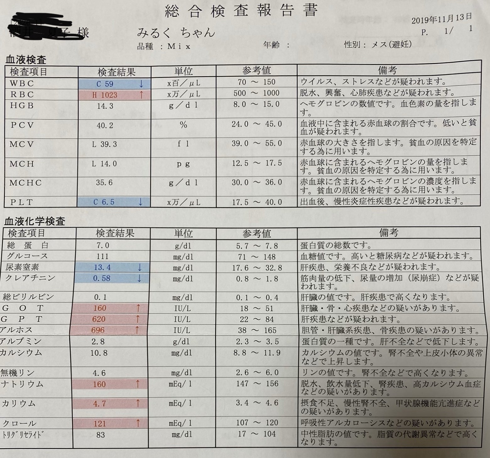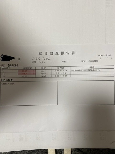 2019年10月。食欲旺盛なみるくが痩せてきた事をきっかけに病院へ行きました。採血の結果、甲状腺機能亢進症、肝臓の数値がアンモニア数値が非常に悪い事が判明しました。。