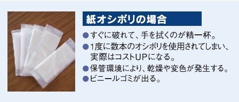 (和食うなぎ店)お客様に常に新品のオシボリが提供でき、除菌されているので衛生的で安心して口や顔にも使用頂けます。