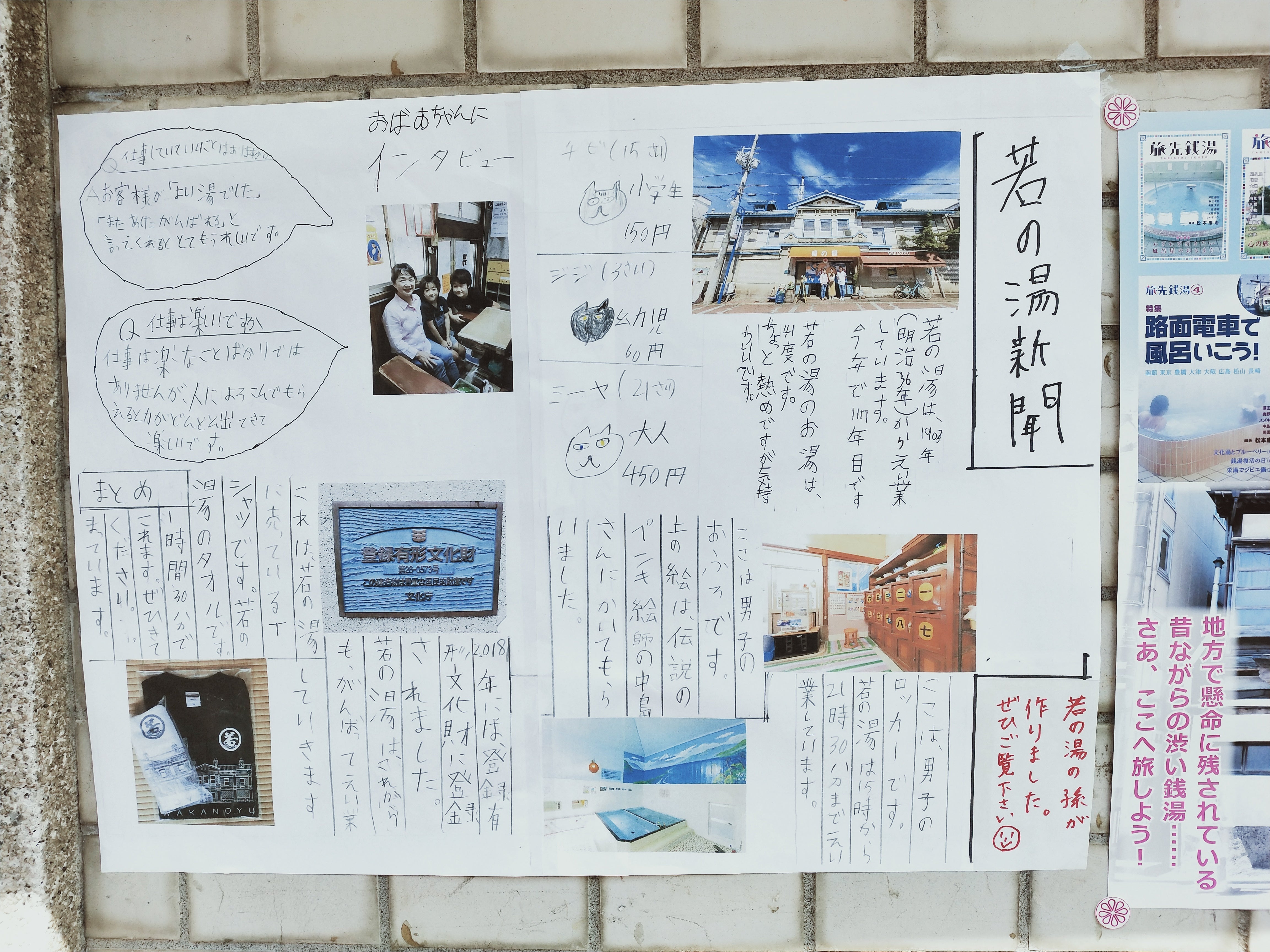 おばあちゃんにインタビューをして、若の湯の情報とおばあちゃんの思いが伝わるように書きました。