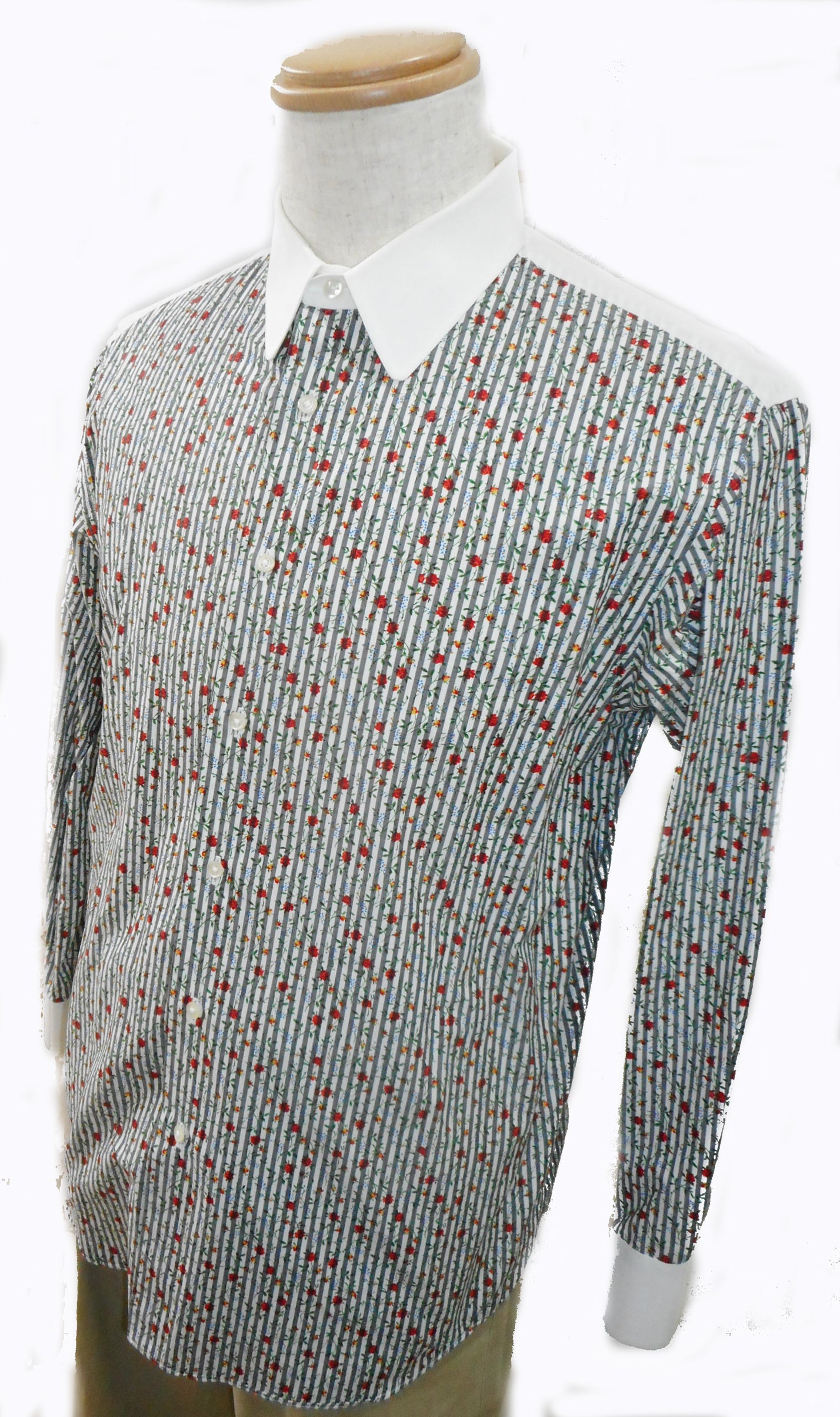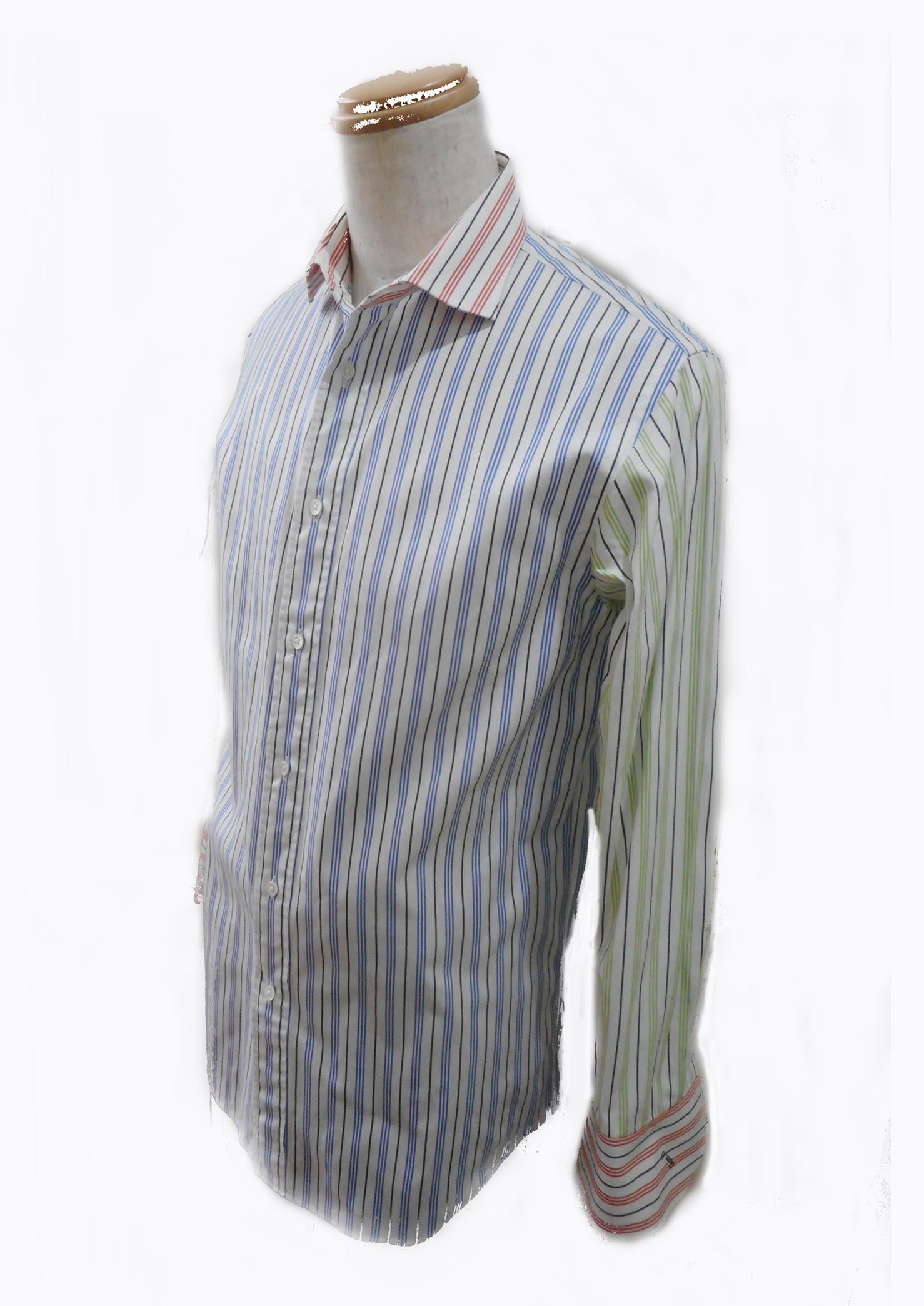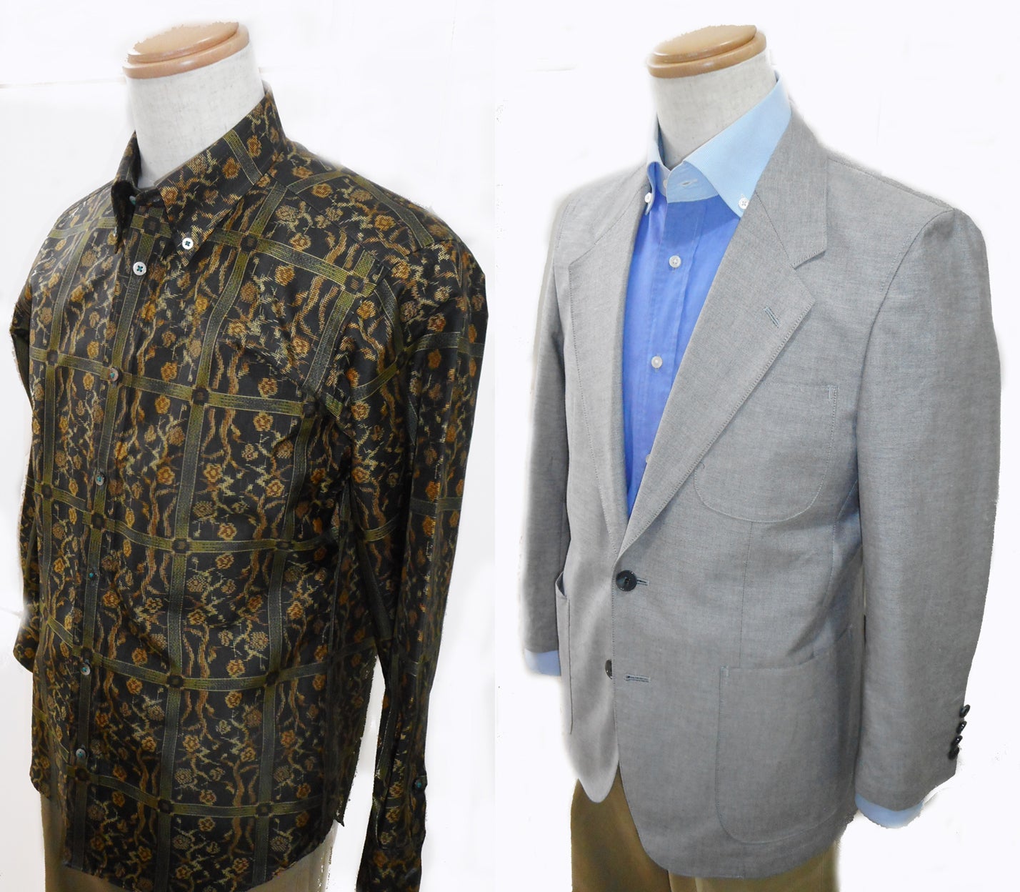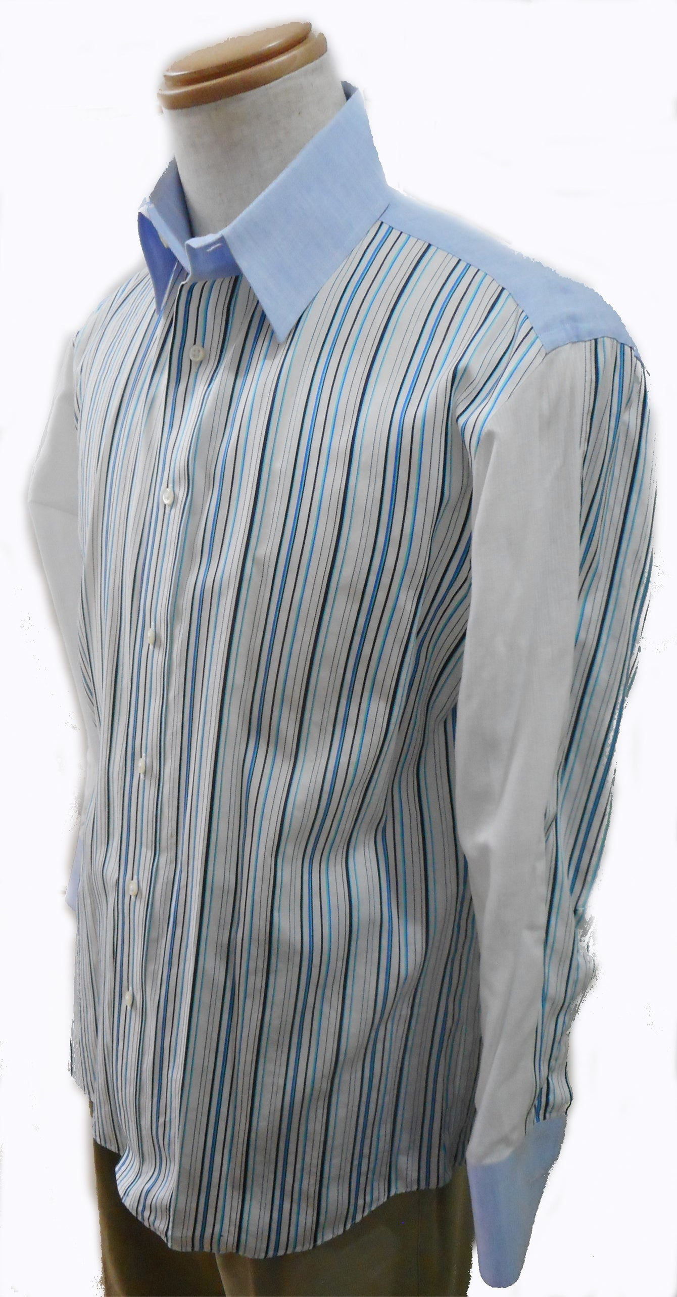 写真のシャツは25パーツ27種の生地で作られています。現在の価格は34,600円(税別)です。新しいシステムで作れば25,500円(税別)になります。このシャツ程度の1着(25パーツまで3ヶ所接ぎ合せまでのオーダーシャツ、税・送料込29,150円)を24,000円でお届けします(限定30着)。