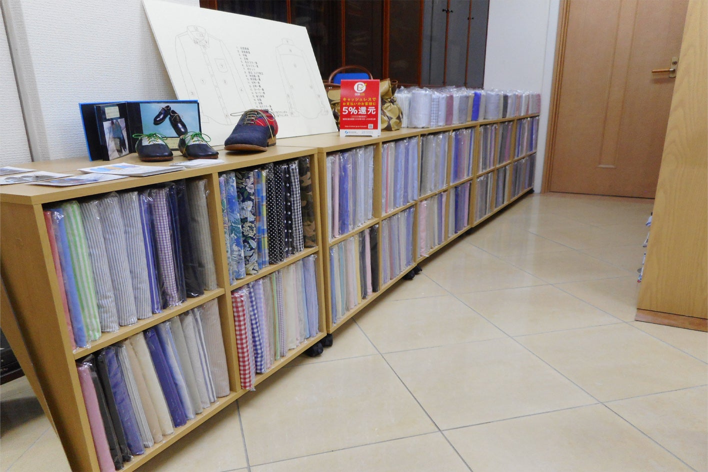 店には常時約800枚の着分生地と約1,200枚のパーツ用生地を出しています。また在庫は約2,000着分と問屋扱いのサンプル帳には約200種の生地が収められています。その中から気に入られた生地を選びお気に入りの1着をお届けしたい。