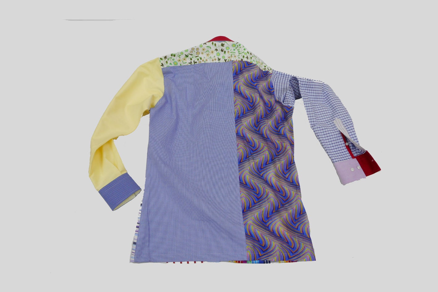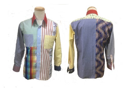 パーツ毎に別々の生地を使って作るクレイジーシャツではなく、幾つかの生地を繋ぎ合わせてパーツにしたクレイジーなシャツをつくる事。