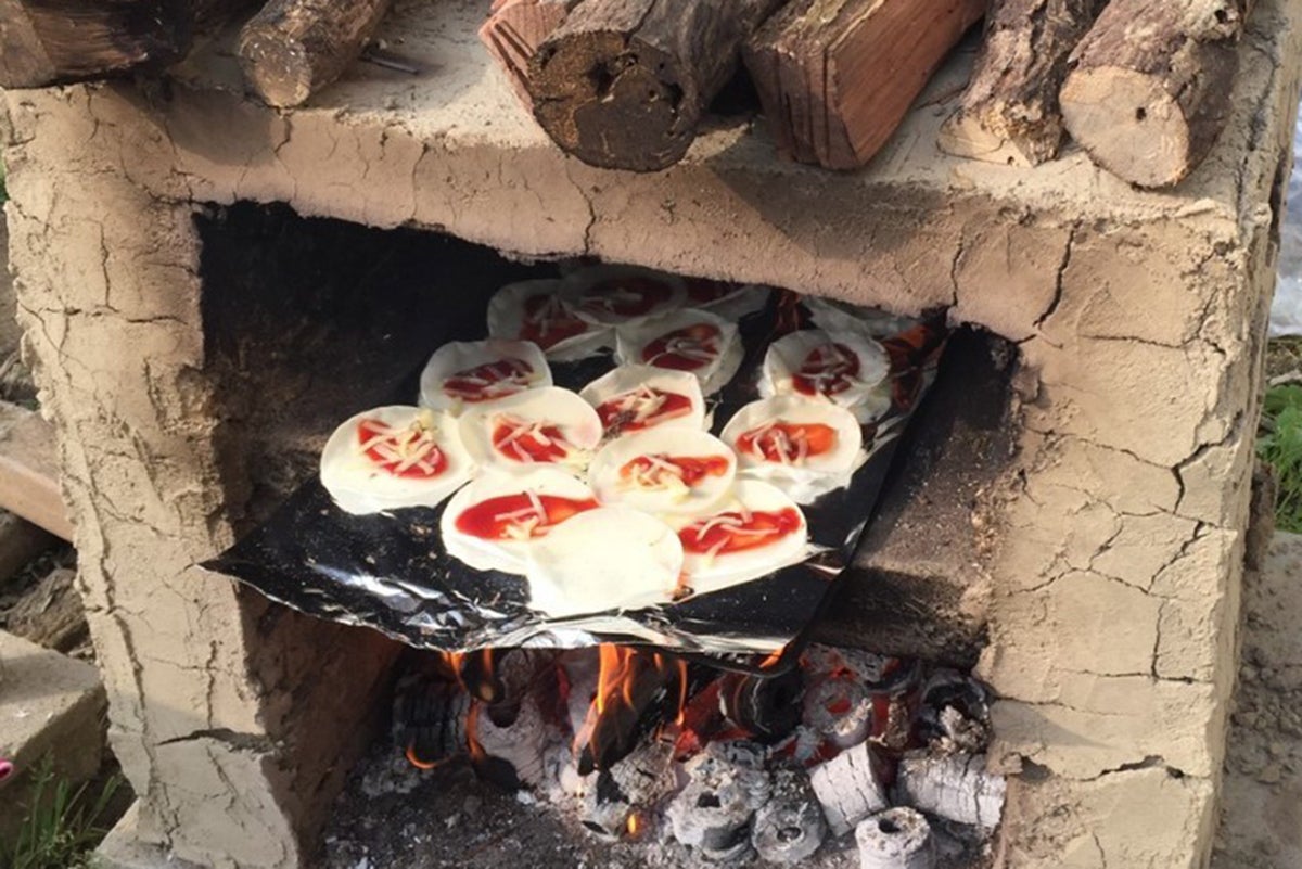 かまど作りでは、土を使ってレンガを積み上げていきます。土の状態を観察して水加減を調整するなど、考えながら手を動かす訓練をすることができます。また、すでに完成したかまどを用意してピザを焼いていますので、ピザもお召し上がりいただけます!
