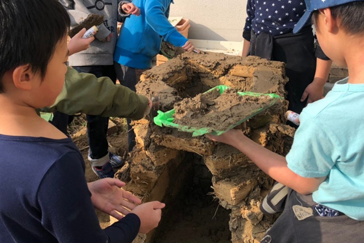自然素材である「土」を使って、土壁塗り体験とかまど作りを行っています。