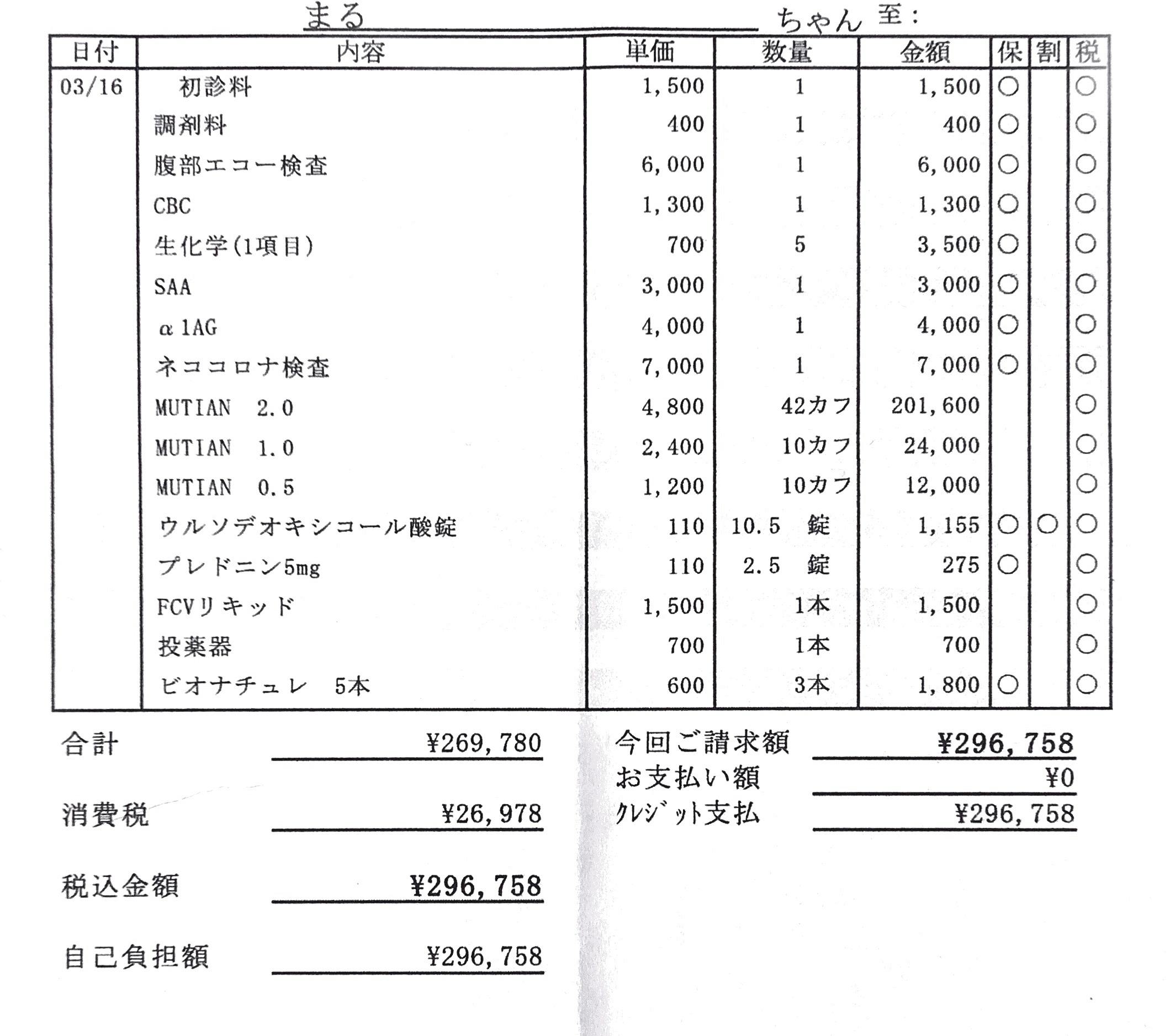 ずら丸の体重は約4kg、MUTIANの1日の投与量は400mgです。1日の薬代が9,400円、1クールの84日間を続けるとなると80万円程の概算となります。体重が増加していけば1日に必要な薬の量も増えてきます。その間の血液検査等、通院の費用も多々掛かってきます。だからと言って簡単に諦められません。ずら丸は家族の一員です。もし治療の支援をして頂ける方がいらっしゃれば幸いです。