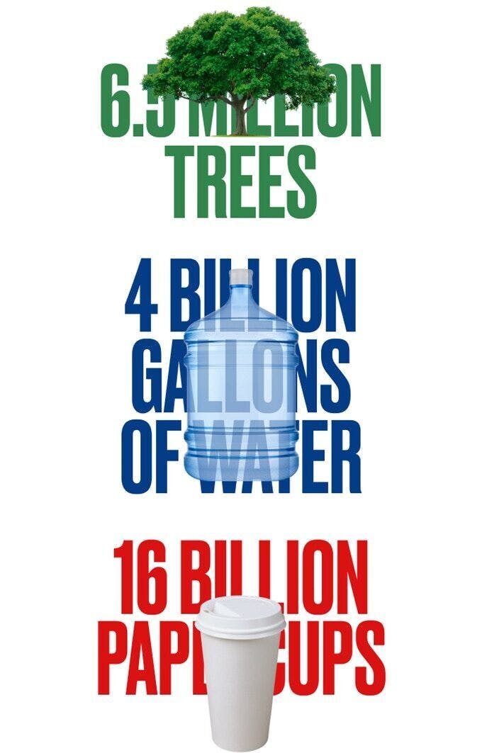 世界の紙類の70%は、植林やリサイクルではなく、天然の森林を減らすことで造られています。また、使い捨てカップには5%のポリウレタンプラスティックが含まれているため、捨てられたカップがリサイクルや堆肥に利用されることはほとんどありません。