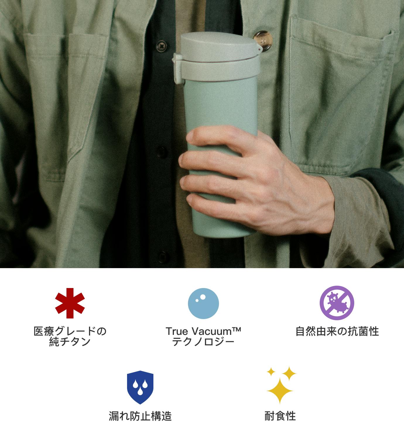 BPAフリーで、食洗機でも洗えるTOKIは、高品質の食品グレードで、リサイクル可能な、高温低温耐性PPプラスティックと、化学的コーティングを一切しない医療グレードの純チタン、最適化されたねじ込みメカニズムを備えた耐久性のあるシリコーンシーリングで作られており、ワンランク上の使用体験を提供します。