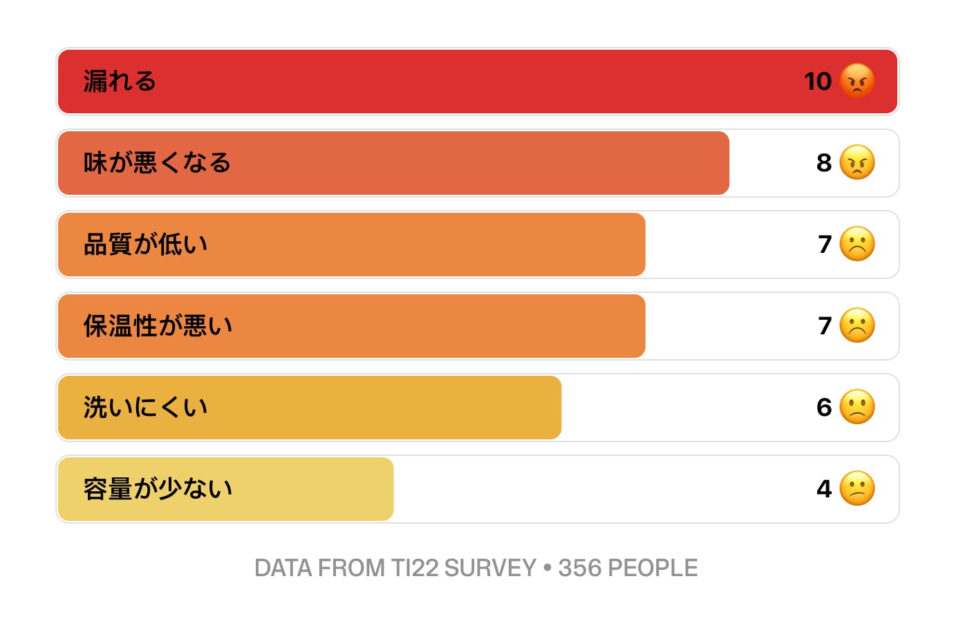 Ti22チームでは、1年以上にわたり、世界中のコーヒー愛好家にアンケートを行い、コーヒーカップの不満点について尋ねてきました。以下がその結果をまとめたものです。