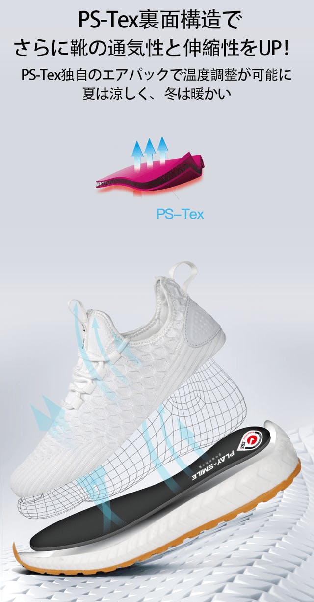 PS-Texは、冬は足を暖かくし、夏は涼しくするように設計され、マイクロエアポケットは外の気温からあなたの足の温度を調整してくれます。断熱エアポケットは通気性を高め、サラサラな一日を体験できます。