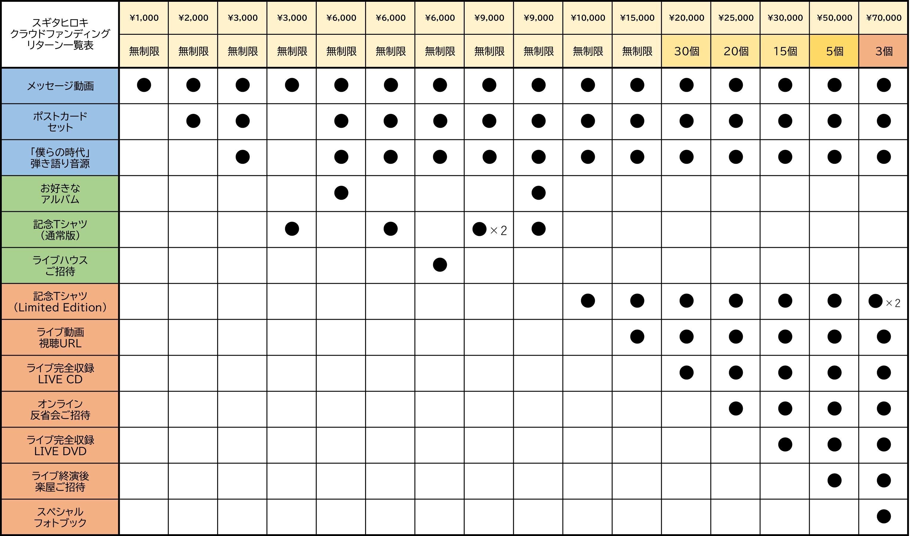 また、上記のリターン一覧表にはない、【法人様/店舗運営者様向け】スギタヒロキ出張ライブのリターンもご用意しております。詳しくはリターン説明をご覧ください(スマートフォンで閲覧の方は、ページの一番最後に表示されています)。