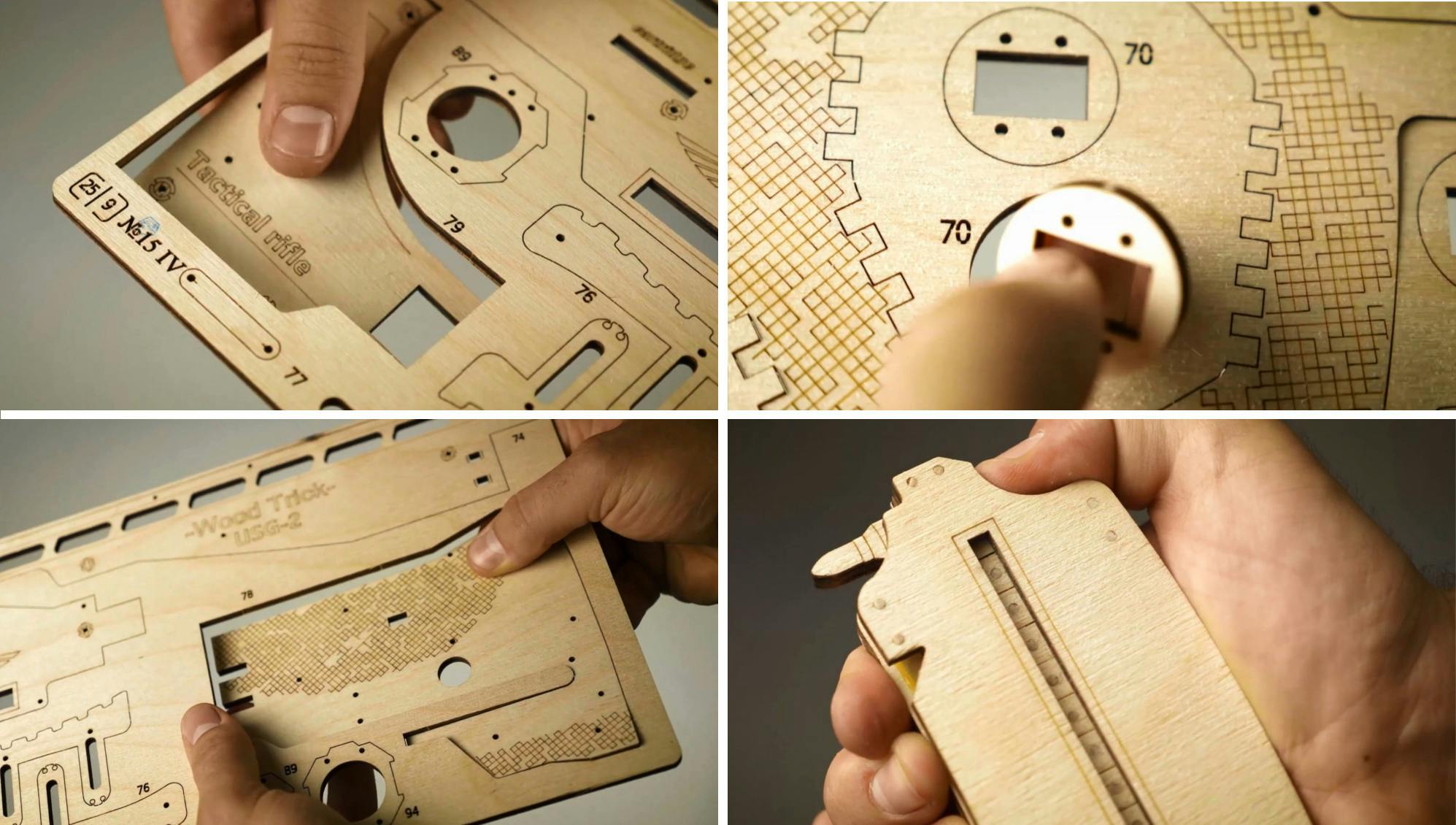 このUSG-2も木の弾をマガジンに入れてゴムの力で撃ち出す事が出来ますので、的を用意して射的ゲームをして遊んだりする事が出来ます。このようにウッドトリックの多くのモデルはゴムの力で弾を撃ち出したり、カーモデルなどはゴムの力で自走させたり、オルゴールが付いていたり実際に動く時計のモジュールが付いていて置時計や掛け時計になったりと、組み立てを楽しむだけでなく、組み立てた後も遊べたり実用的に使ったりする事が出来るのです。