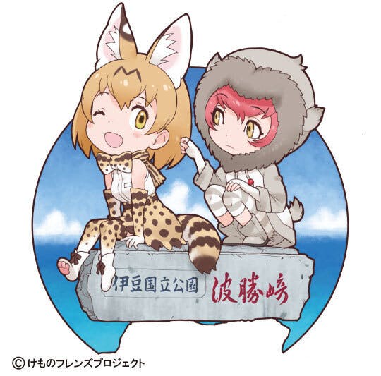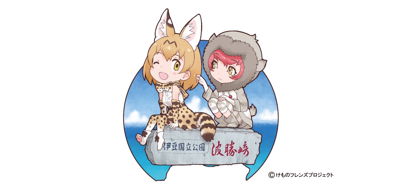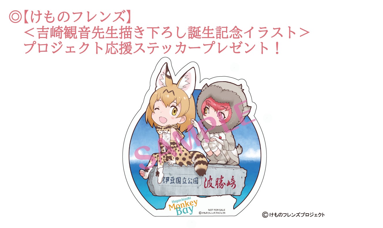 波勝崎モンキーベイの誕生を記念し、なんと吉崎観音先生から新しい描き下ろしイラストが届きました!波勝崎モンキーベイの象徴となる「伊豆国立公園 波勝崎」の石碑の上に、サーバルとニホンザルのフレンズが描かれたかわいいイラストです。