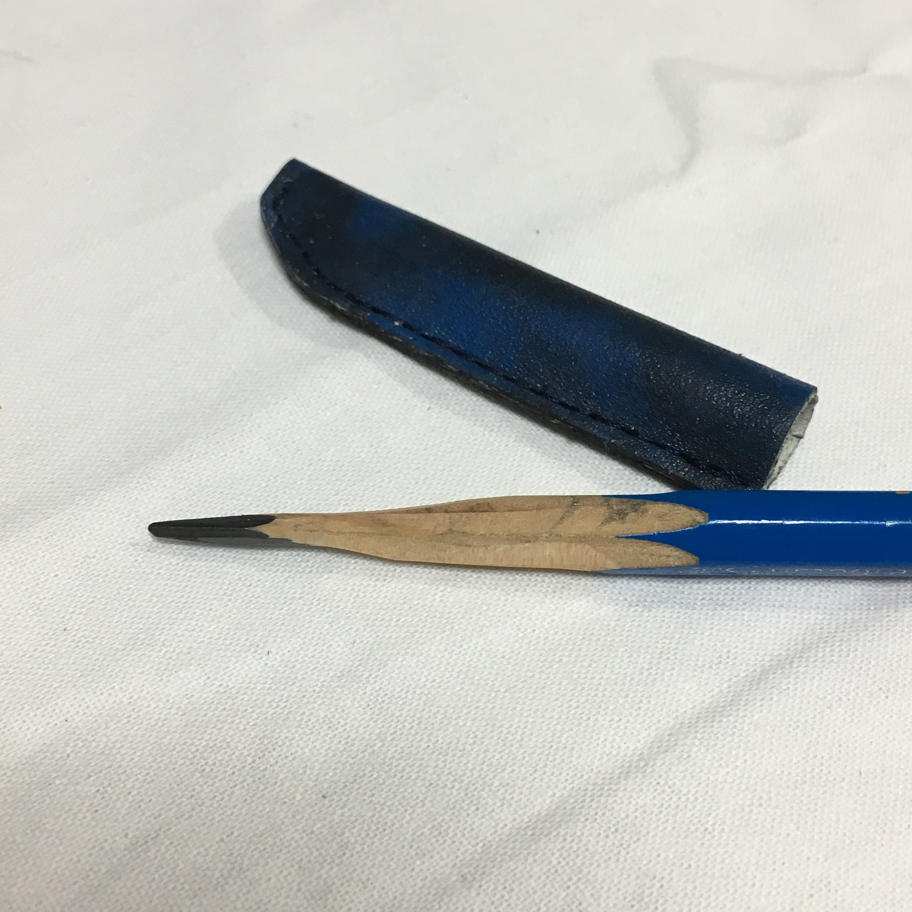 白い革の端切れを顔料でムラ染めし鉛筆の持ち手の青に合う色にしています。