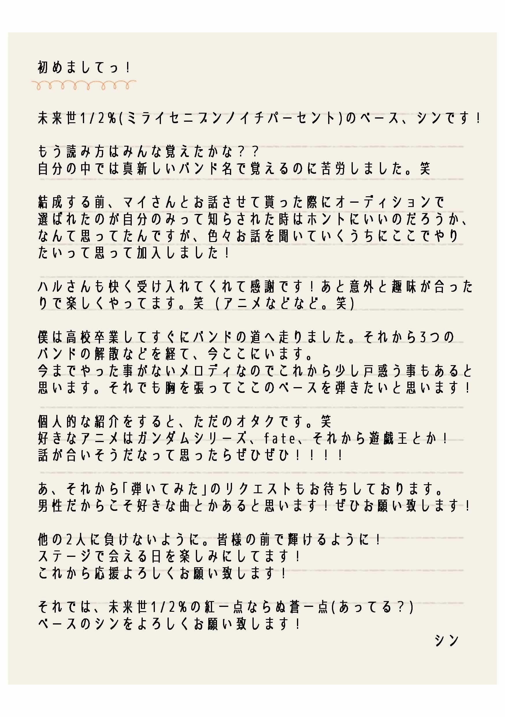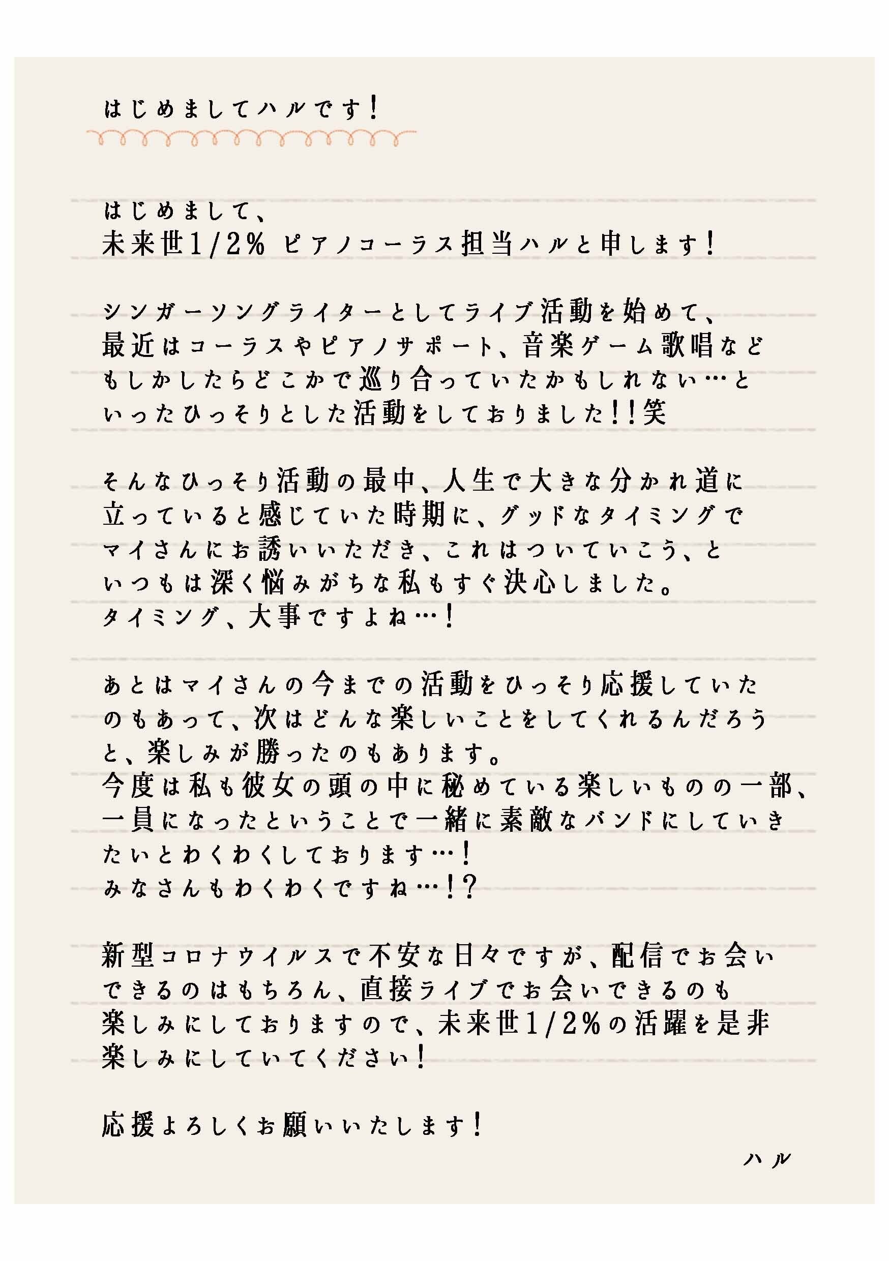 Vocalのイロハ(イロハマイ)が昨年ソロ活動5周年を迎えて、新しくバンド活動に挑戦したいと考え、webオーディションを行ったり、自ら声をかけてバンドメンバーを集め『未来世1/2%(ミライセ ニブンノイチ パーセント)』を結成しました。