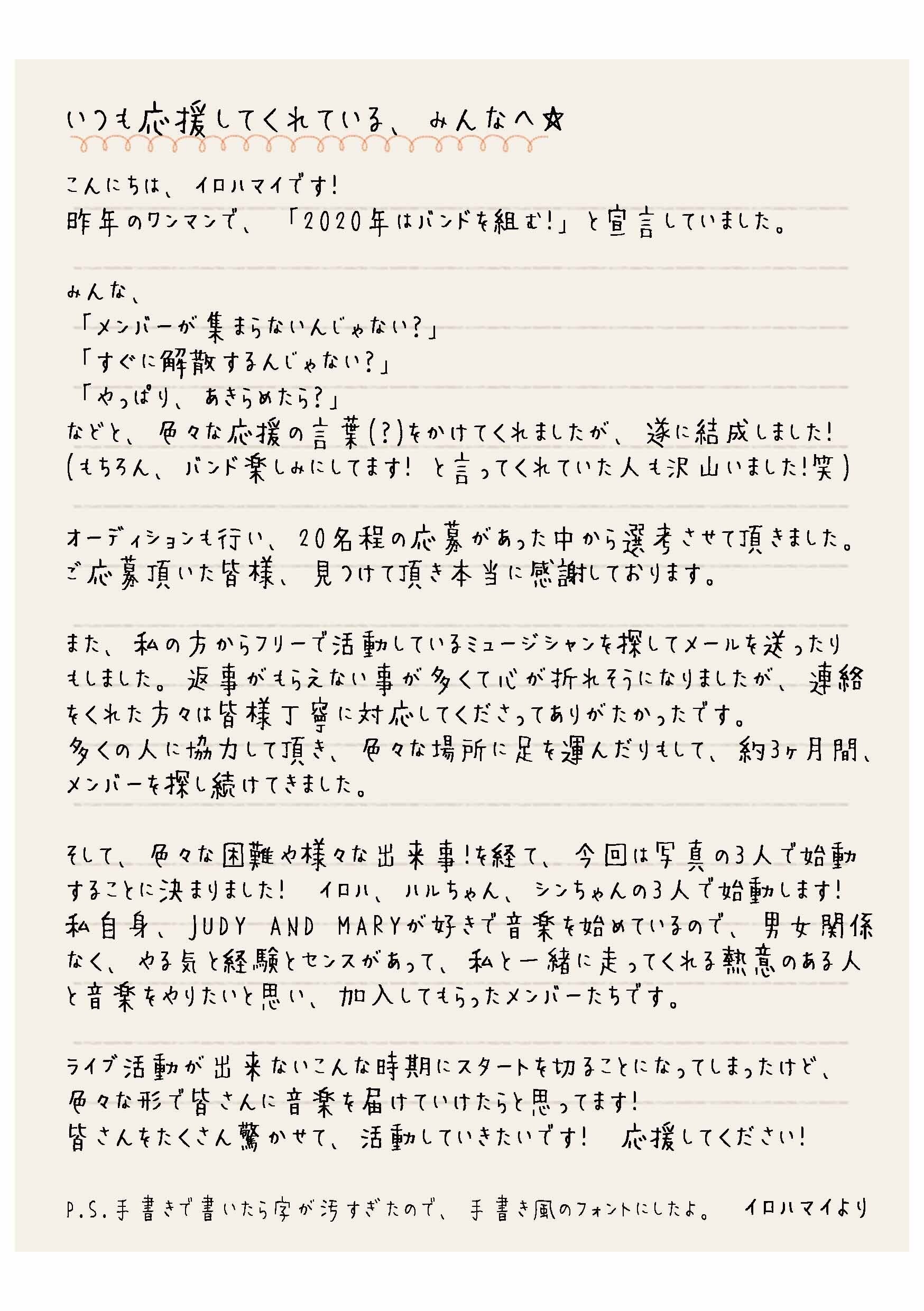 本来であれば、一人でも多くのファンの皆様と一緒に、新しいバンドの初ライブを迎えられたらと願っておりました…。