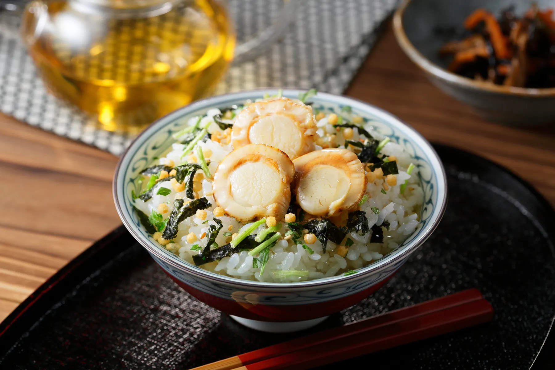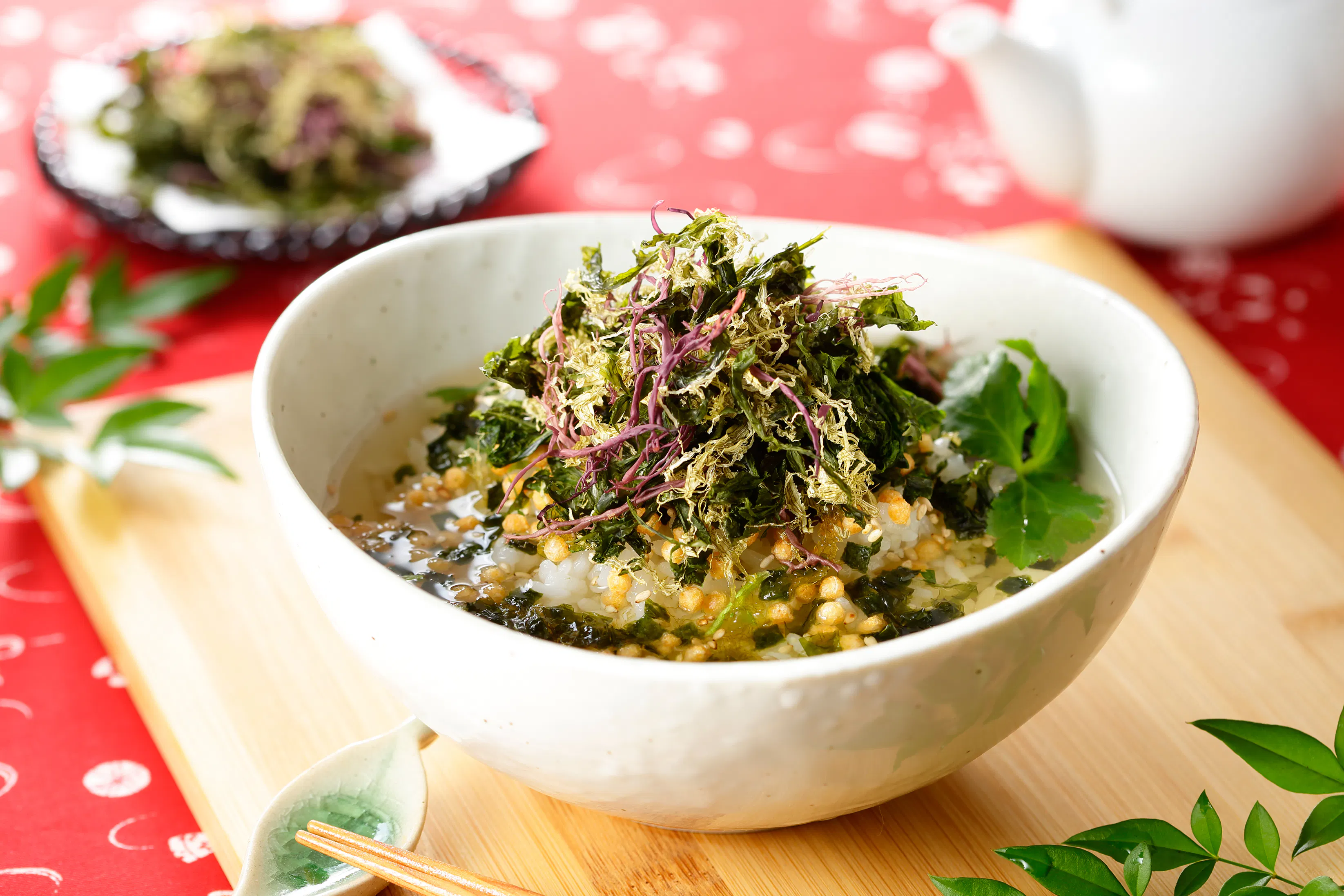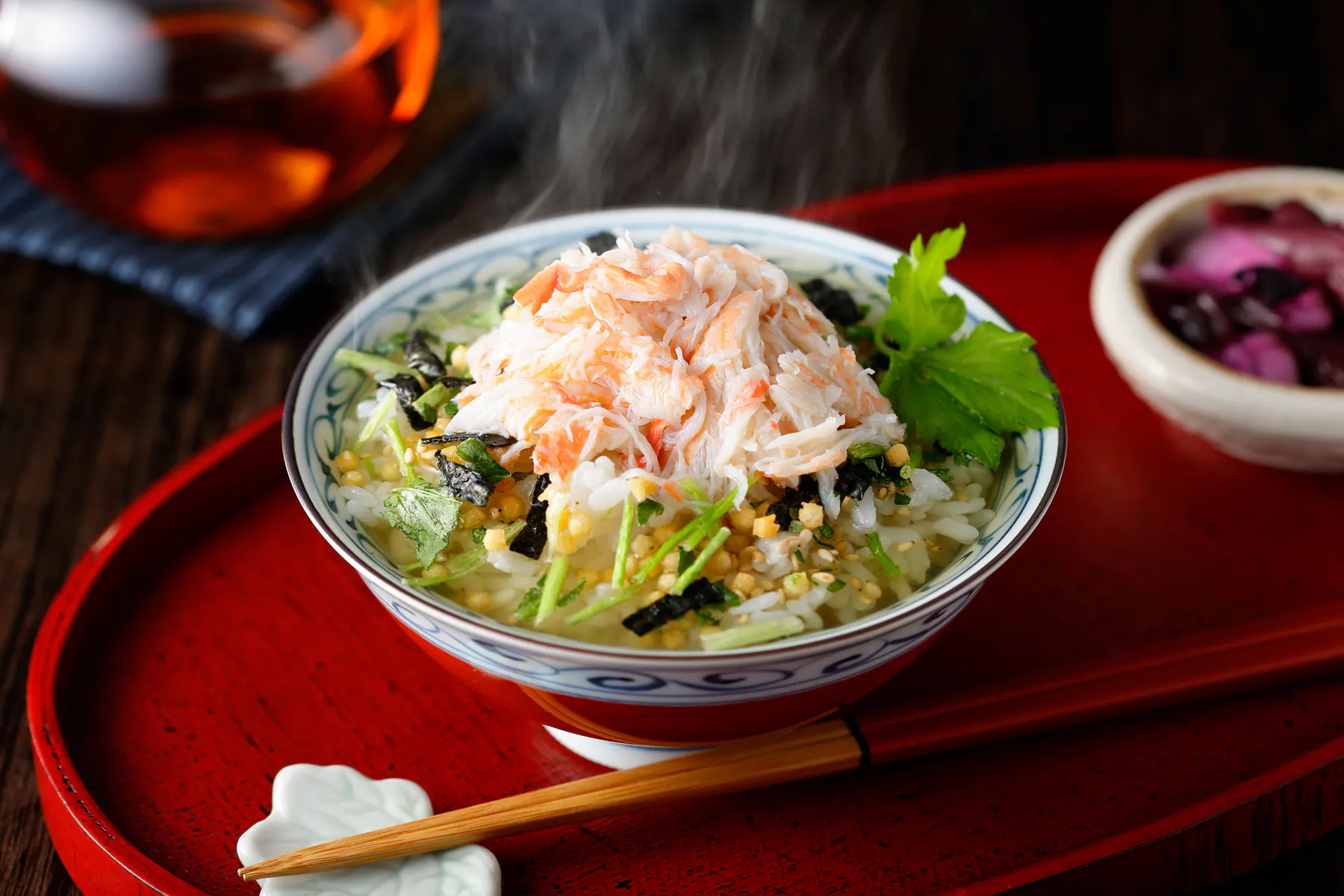 帆立エキスと化学調味料不使用のだしつゆが相性抜群の体に優しいお茶漬けです。