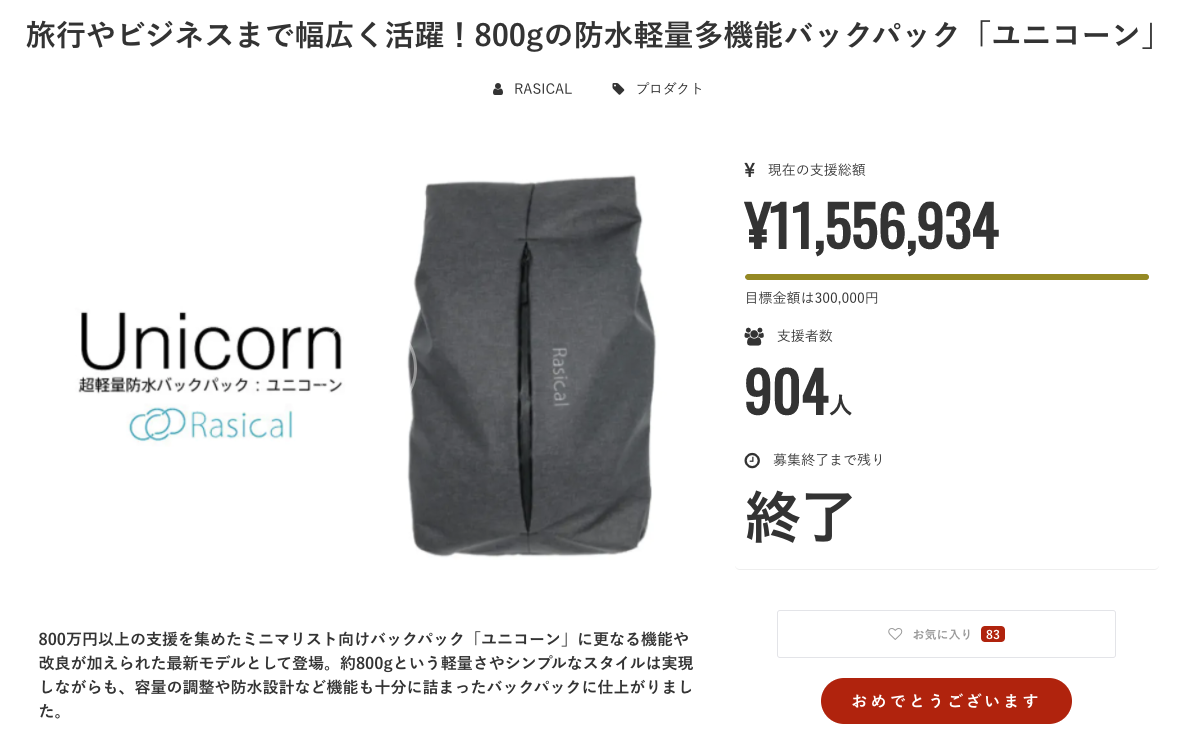 また、ミニマリスト向けの製品「ユニコーン」バックパックや「ニルウォレット」「マグッピ」などの製品化をクラウドファンディングで募り目標を大幅達成し、製品化しています。