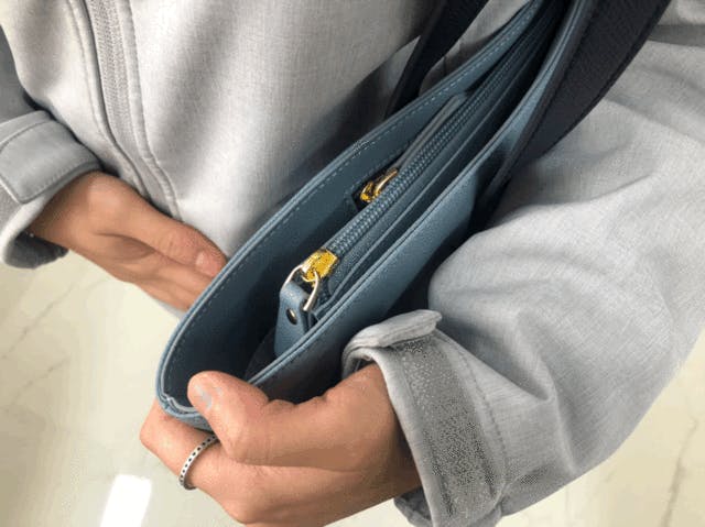 バッグ裏面にもジッパー付きポケットを設置。これらのアウターポケットはバッグを肩にかけたまま中身を取り出せるので、通勤通学での定期の出し入れなどに便利です。
