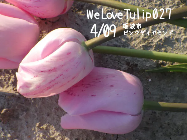 表紙のチューリップはウイルス病に侵されたピンクダイヤモンドという品種です。ピンク色の花びらに赤紫に入った斑模様が病気のように見えますが、これは1~2週間ほど前に降ったアラレによる打撲のような症状でウイルス病とは関係ありません。ウイルス病の症状は薄くまだら筋状に白く抜けた模様になります。畑の中から、このような症状のチューリップを1本づつ見ながら探し、球根ごと抜き取ります。