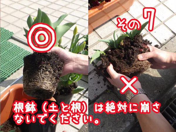 タイトル画像はチューリップのポットを植え替える場合の最も注意すべき、「根鉢」をくずさないこと、チューリップの根はパンジーなどのように新しい根が再生して来ないので、くずしたり・傷つけたりすると水を吸いづらくなり、元気に育たなくなります。