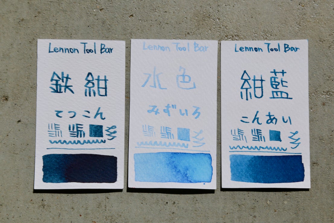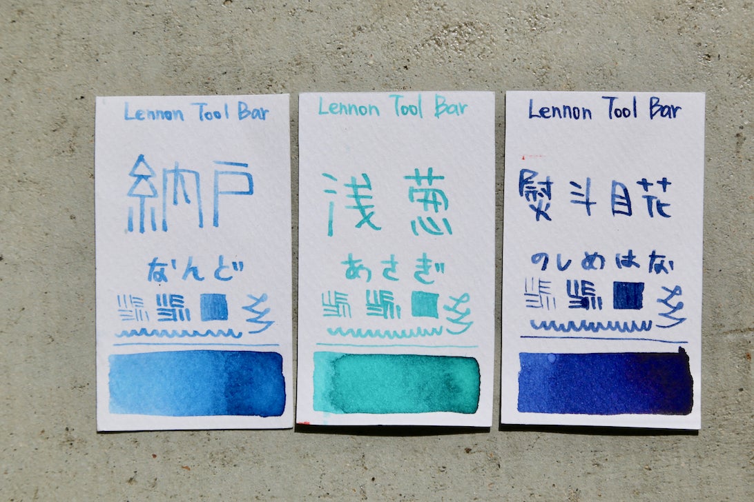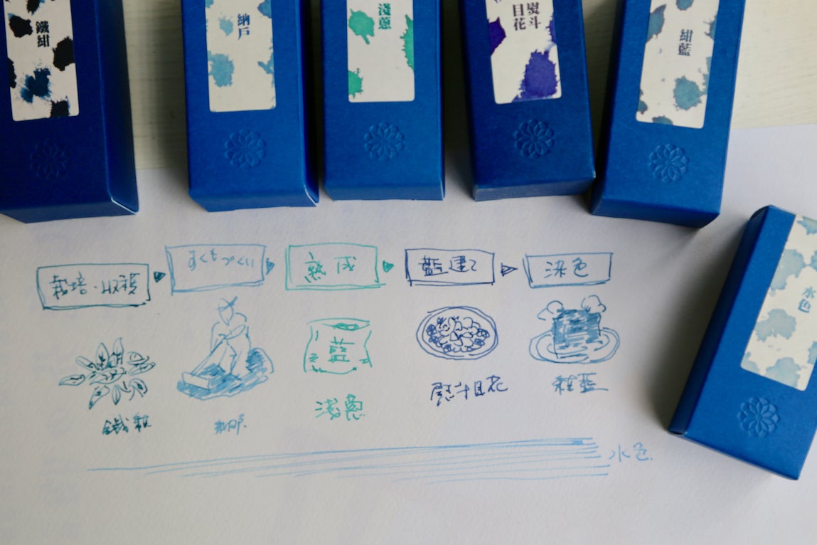 藍濃道具屋がプロデュースする万年筆用インクの定番「藍染め風」コレクションには、全て日本の藍染の伝統的な色の名前が付けられています。