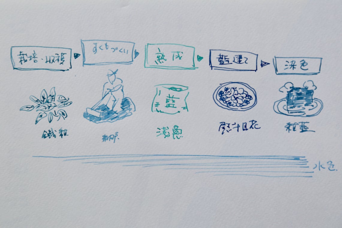 藍染の工程には「栽培」「収穫」から始まり「すくもづくり」「熟成」「藍たて」「染色」・・