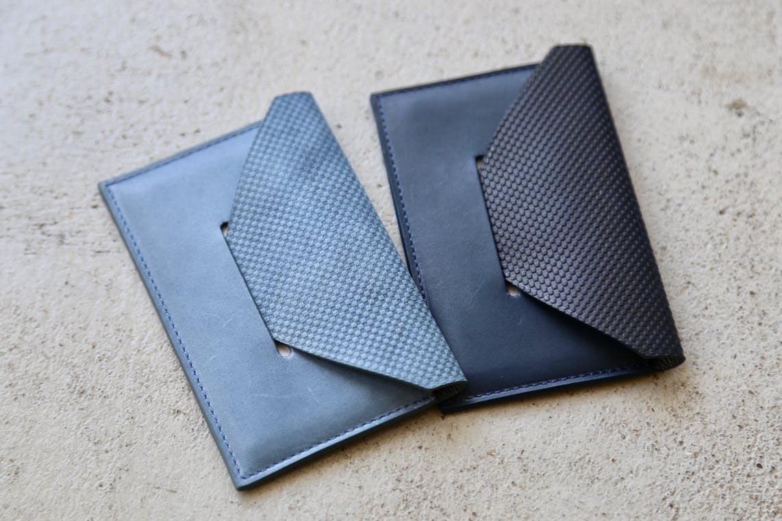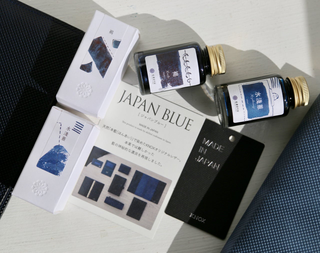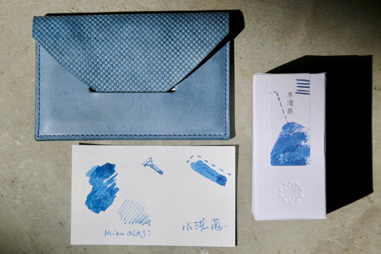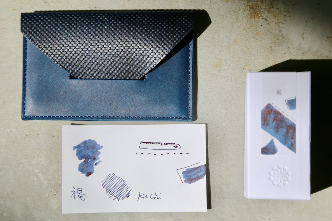 今回のリターンには藍染の美しい色合いを広めたい藍濃道具屋と日本のこだわり革小物ブランド同士の間でのカラーコラボレーションが実現した限定インクも含まれています。