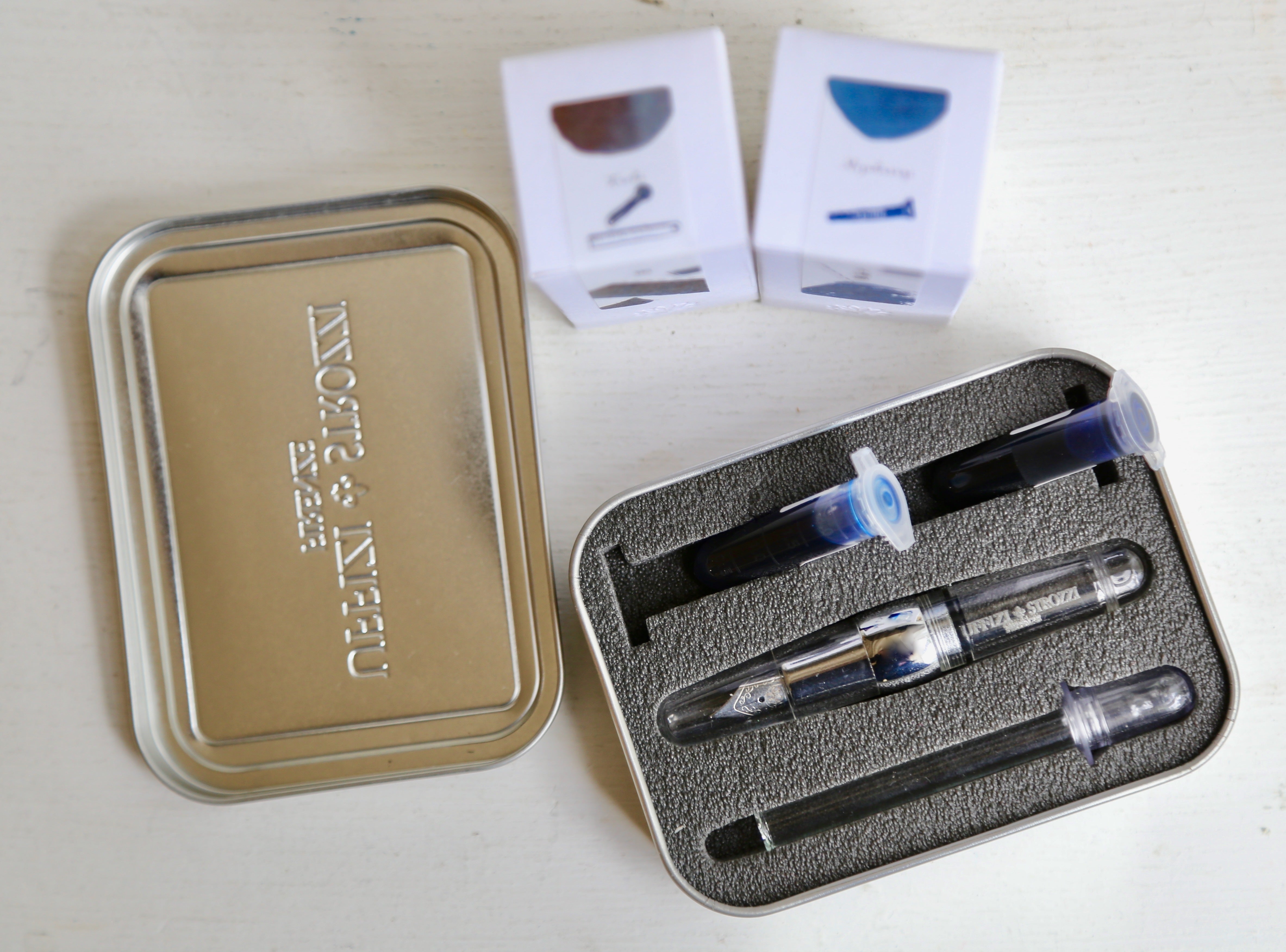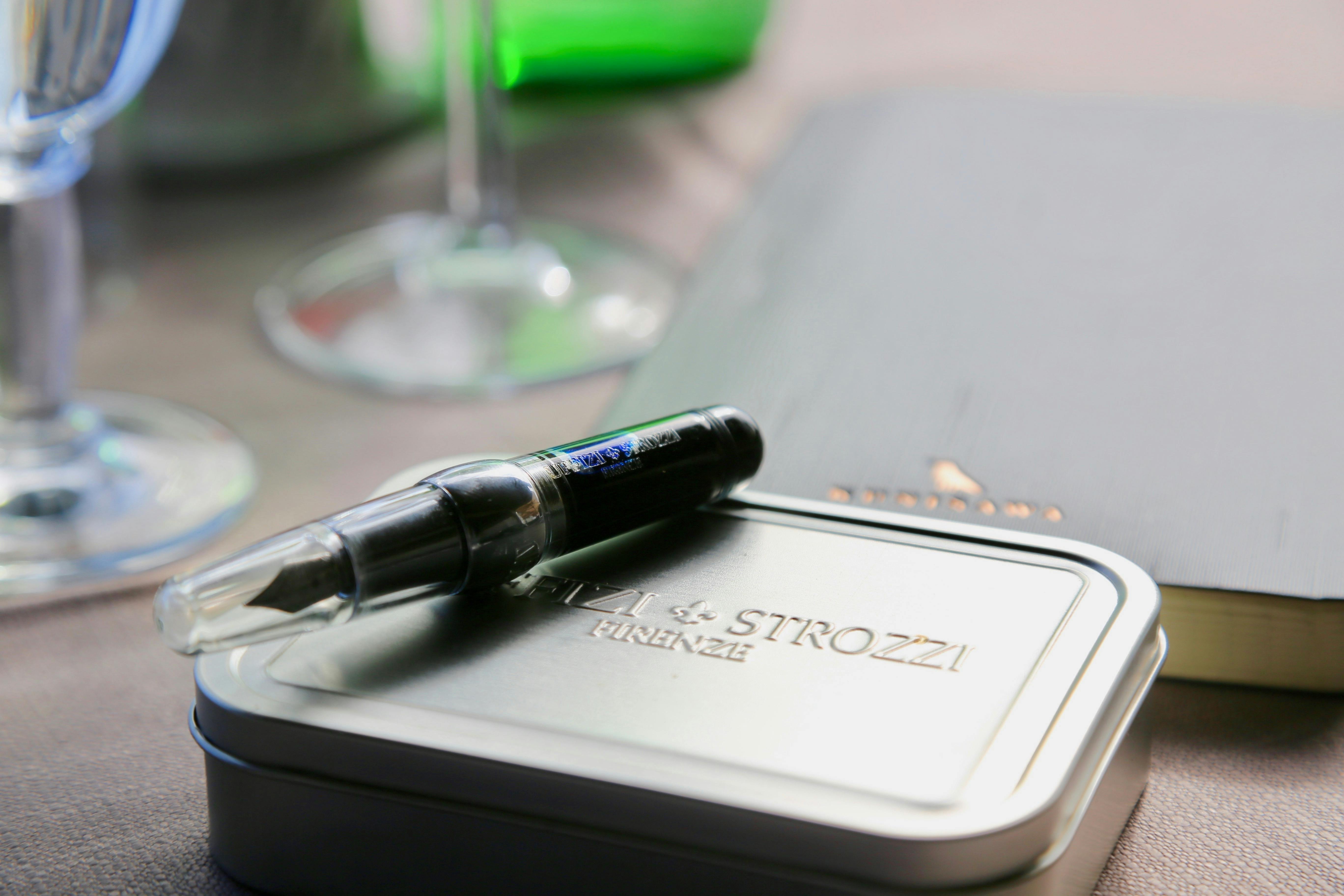 ・・ちなみに鉄製のペン先はドイツの専門業社より仕入れたものを、イタリアの工房で1つずつこのオリジナル万年筆のブランド名にちなんだ実在した貴族「ストロッツィ家」の紋章をデザインしたゴマークを刻印しています。